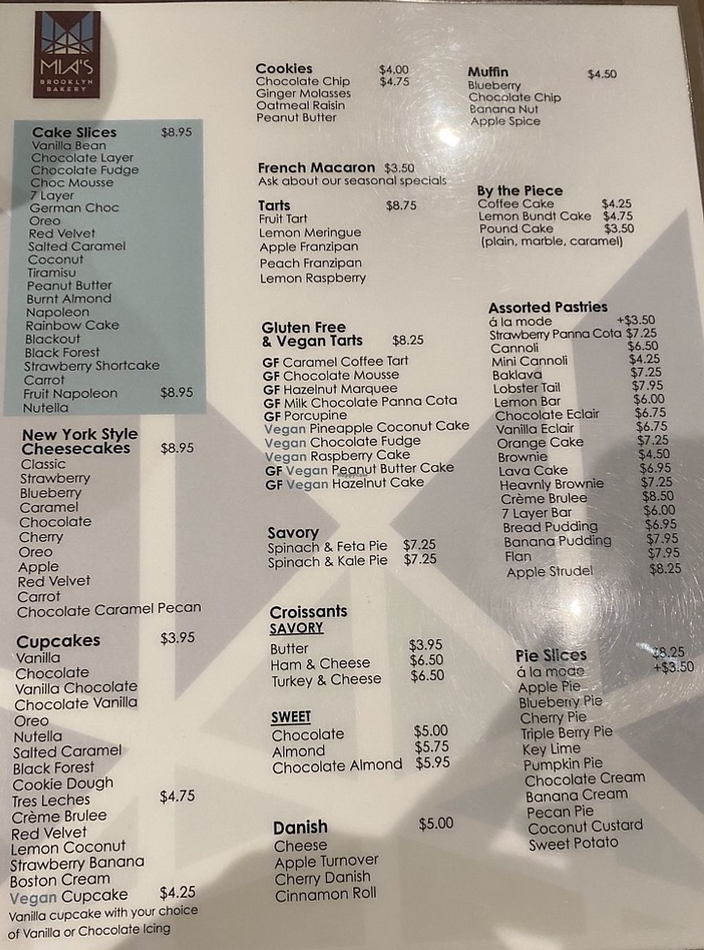 Mia’s Brooklyn Bakery is a bakery with mainly a mix of American and French style pastries, desserts and a large variety of drinks. Some drinks are naturally vegan and most can be made vegan with plant-based milks. It offers clearly labeled vegan tarts and cupcakes. Mia’s provides a list of clearly marked vegan tarts under the Gluten Free & Vegan Tarts section of their menu as well as vegan vanilla & chocolate cupcakes under the cupcake section and 4 types of plant based milks for a surcharge (Soy, Almond, Coconut, Oat Milk).