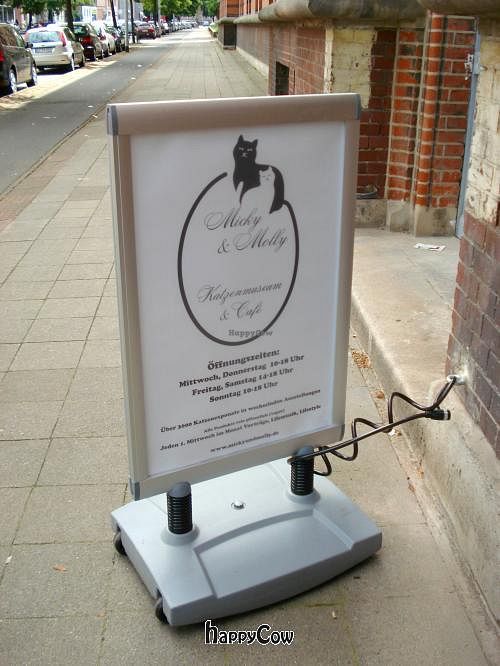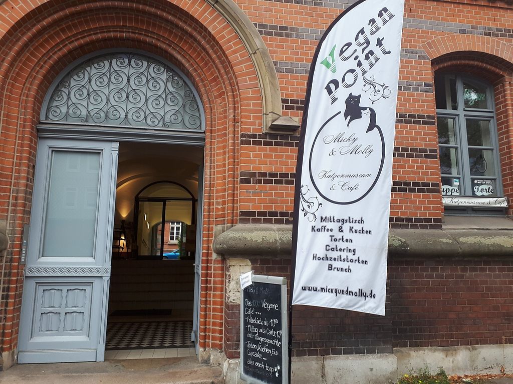 Located inside the former tax office, next to a vegan supermarket. Several bus stops close by; by bus, 7 minutes to inner city and 7 minutes to main train station. Very good, fresh vegan food: Chili sin carne, soup of the day, cakes galore, good coffee, lemonades and much more. Quite large space, around 20 seats inside, none outside. Lots of cat pics and figurines, obviously. Very clean and nice place, vegan journals, too. You can bring your relatives, they will like it, too.