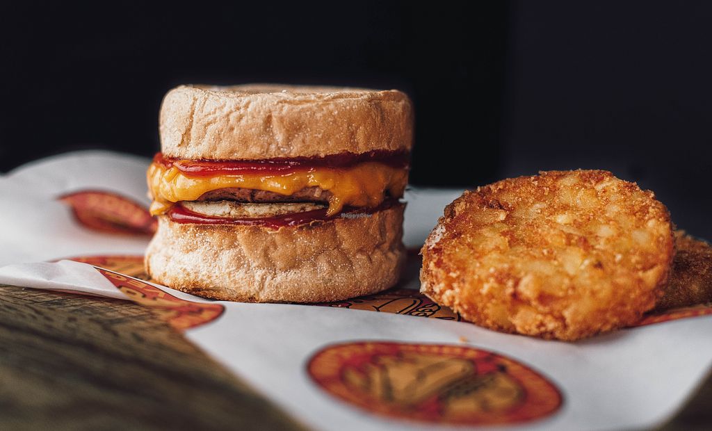 Pancakes with sausage, bacon, maple syrup and hashbrown bars. Plus an …