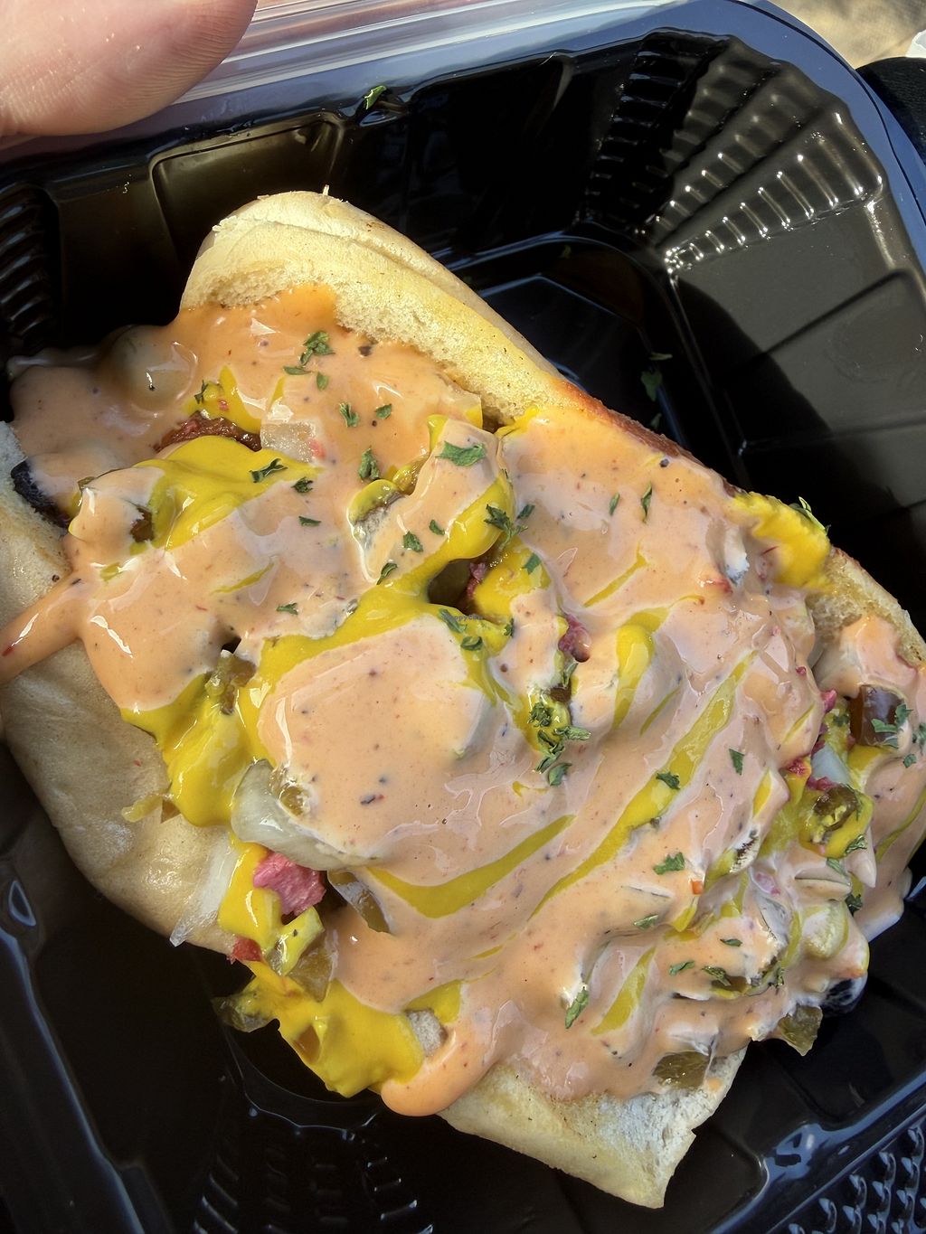 I ordered a Philly cheesesteak and some fries. Ate the fries first they tasted salty and sweet( sweetness, kind of threw me off). A Philly cheesesteak it was pretty good although I will admit it was a little bit dry, but that’s fine and then I drink some of the blueberry lemonade, which was freaking amazing!!! $37 for an order though felt a bit overpriced for what I got. Definitely a great experience though (other than the fries)