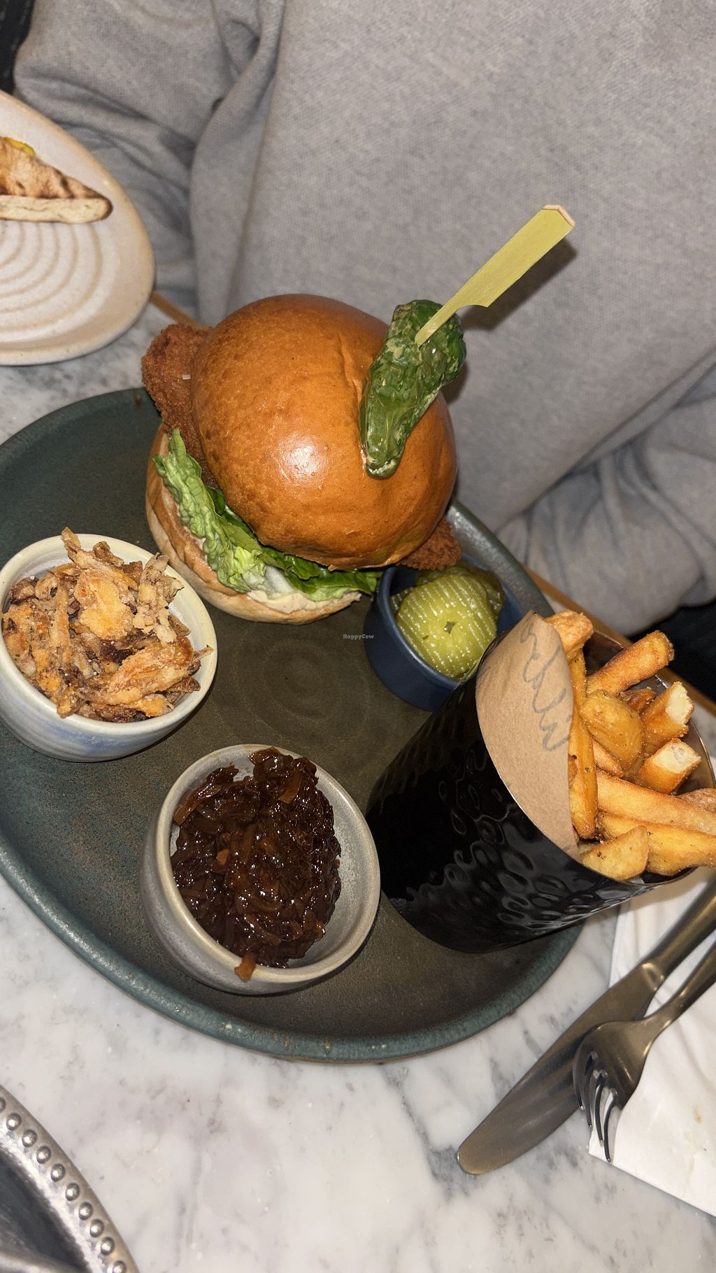 The food was amazing, the location is a beautiful space, and the service is top tier. The server anticipated my need for more napkins before I even asked (needed for the Korean chick’n burger!)