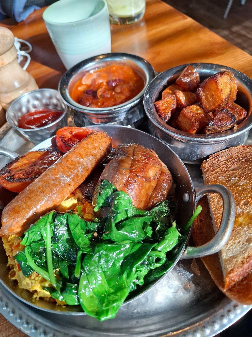 The full English didn't include bacon, that was an extra £4. It came with one sausage, an extra £5 if you wanted another. No hash browns either. The beans were spicy beans in a cup, the tofu scramble was wet and tasteless, the spinach and tomatoes were just a soggy mess. There was some nice toast and potato cubes but that was about it. It was worse than a wetherspoons vegan breakfast, yet 4 times the price.