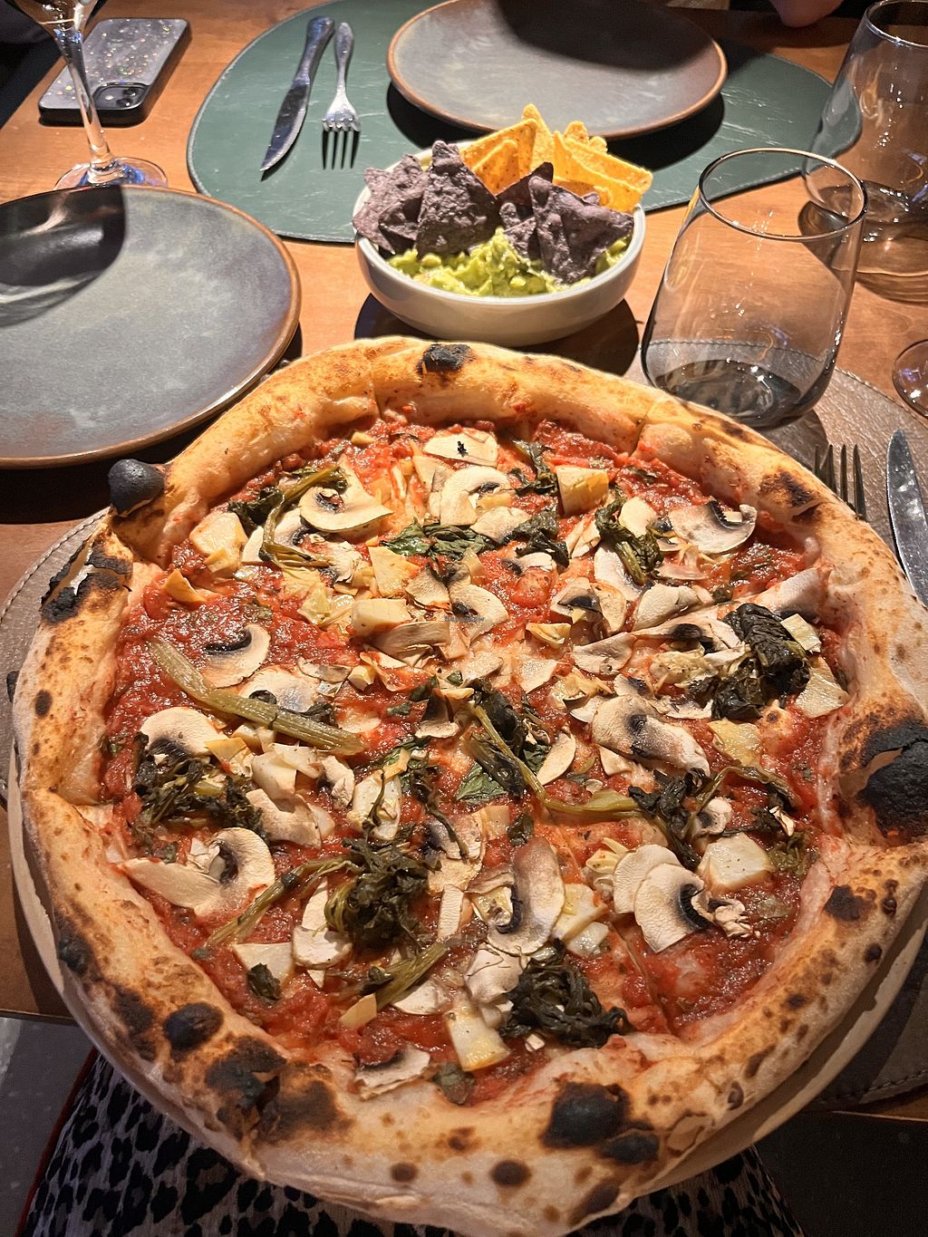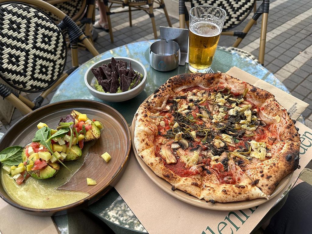 We were both hungry and ordered from the vegan menu which had 6 items. They are marketed as mains but looking at some of the dishes on their online menu, some looked small like side dishes so we ordered a few dishes. Prices did not vary much between them despite vast difference in size. We had a vegan pizza each, grilled avocado salad and guacamole and tortilla chips. The grilled avocado came with feta which I think was a mistake as it didn’t state that on the menu so maybe it was the non vegan option by accident. We didn’t complain and just picked them off. We just wanted to get on with eating. Other than that the food was tasty, particularly the tortilla chips and guacamole. The pizza was a bit soggy from the sauce but was very filling.