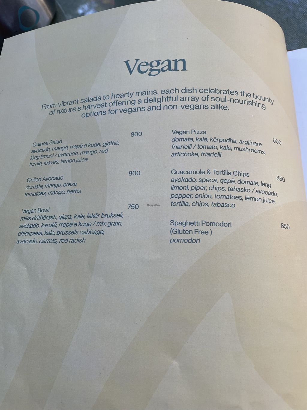The menu looked promising as there was a separate part with vegan/vegetarian options, but unfortunately they did not serve these until later (though it did not say so). Had to choose from the regular menu which meant I could only order the avocado toast, without all the toppings (poached egg and something else non-vegan). Making it the most overpriced regular avocado toast I’ve ever had (like 8/8,50 euros in a country like Albania). In my opinion they could’ve done a bit more to accommodate, perhaps even reduce the price as I barely had a meal. Too bad. Won’t recommend this place.