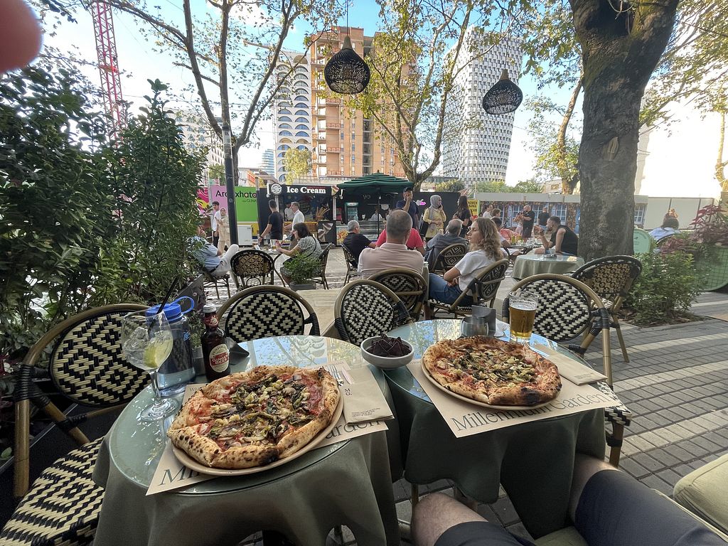 Very nice as you can sit in the garden and order from several restaurants/bars in the area. Especially the indian food with lots of vegan options.