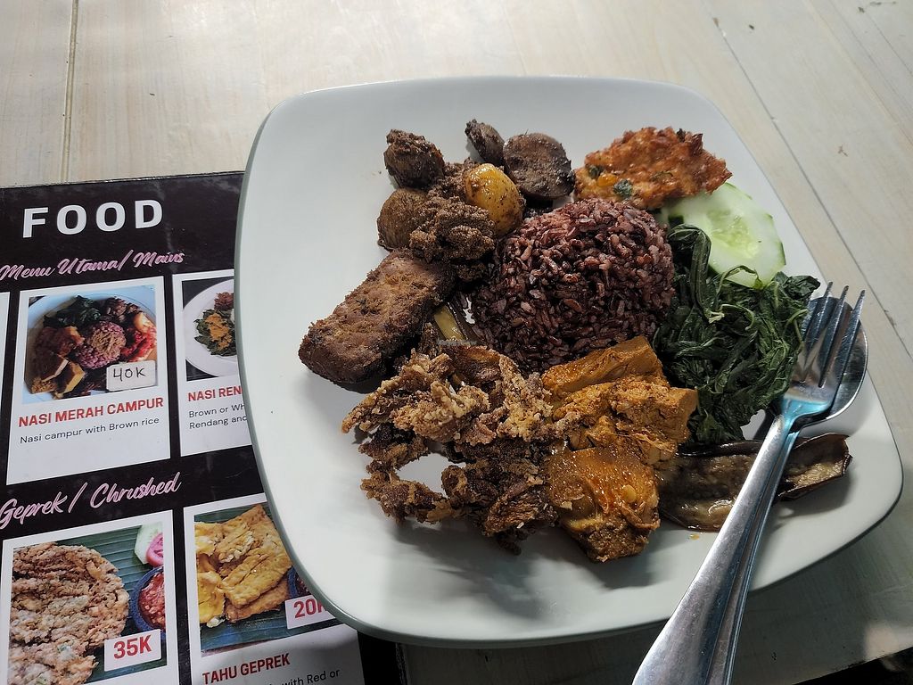 I had the red nasi campur (red rice with multiple dishes) and it was so delicious. Big portion for 40k. Definitely a must pit stop if you're in Ubud. Apparently they've recently just opened a new branch in SAYAN area, about a couple of weeks ago, but not registered on Happy Cow yet. It's called Vegan Food, and you'll find it on google Map (Vegan Food Sayan)