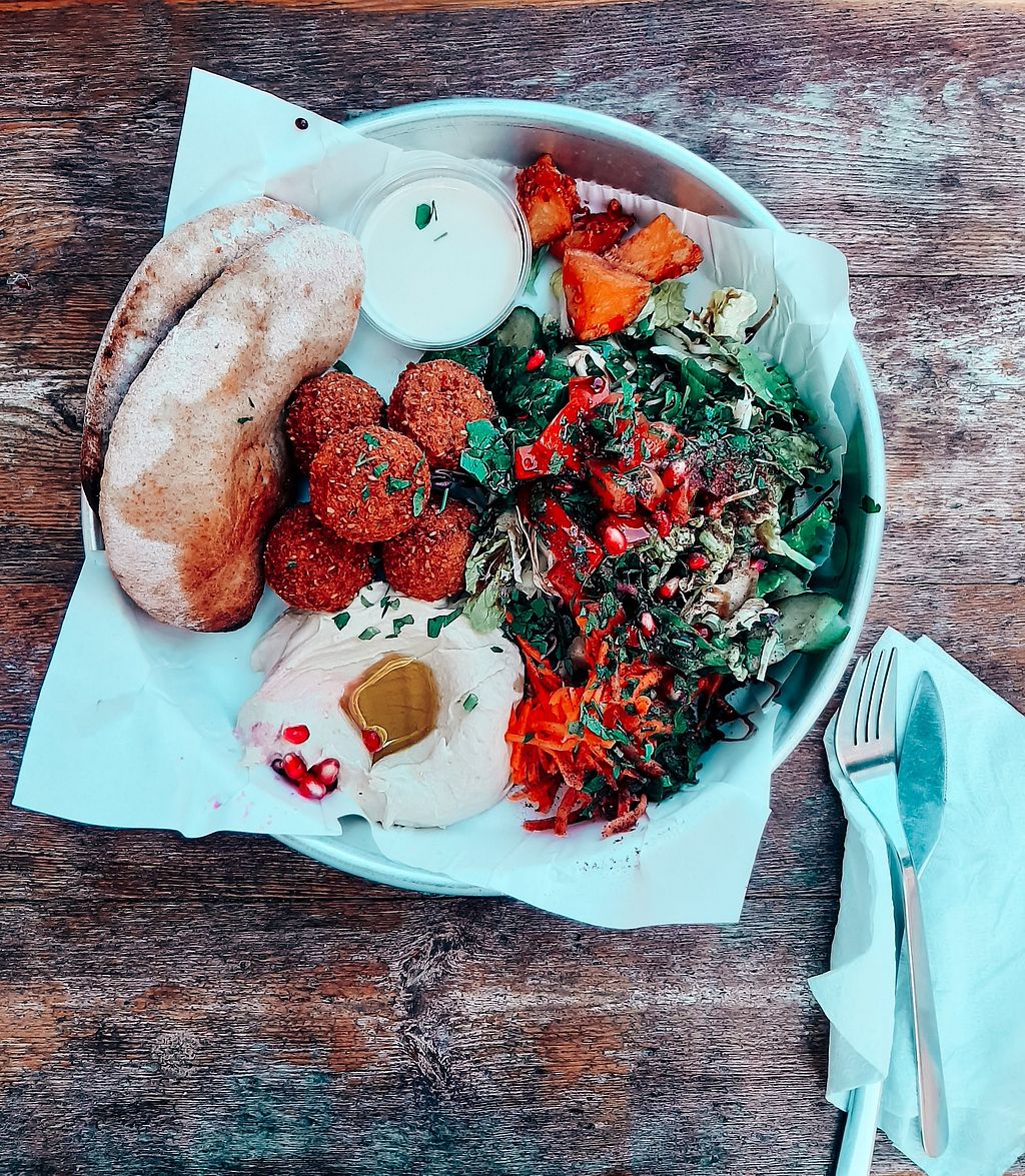 Serves meat, vegan options available. Syrian restaurant offering falafel, hummus, salads and more. Please note that hummus or sauces may contain milk/yogurt - ask staff. Jan '23 removed due to limited vegan options.