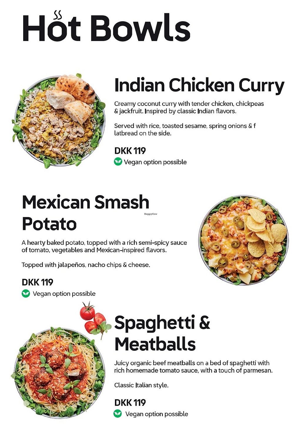 Latest menu - vegan options are labelled with a carrot symbol.