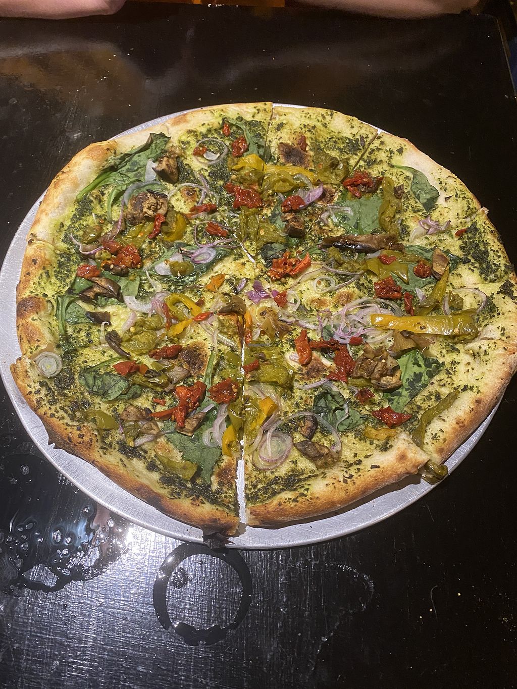 Pesto Pizza with sundried tomatoes, onion, eggplant, spinach and vegan…