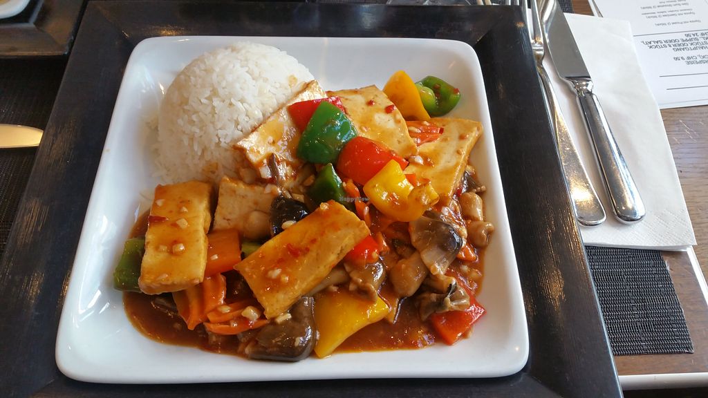 Serves meat, vegan options available. Asian cuisine restaurant with several vegetable-based dishes like szechuan seitan, udon miso soup, and chop suey. Vegan dishes are marked. Portions are on the small side, so you might order a couple different ones. Reported soy sauce may contain fish sauce so check. Reported closed September 2020.