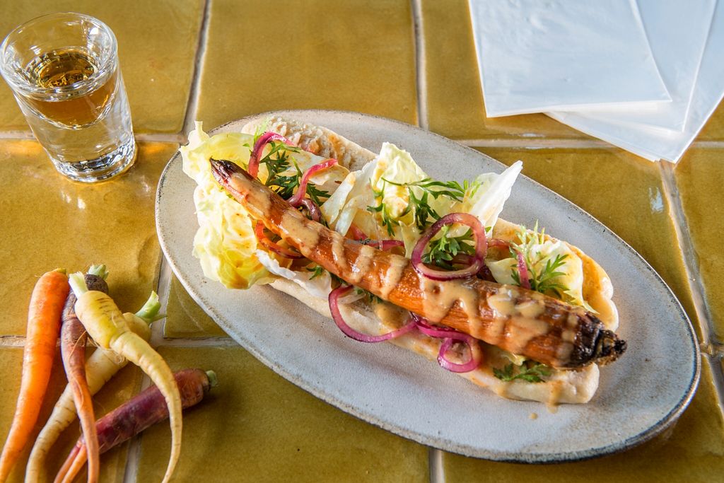 Carrot hot dog with spicy aioli on steamed bun
