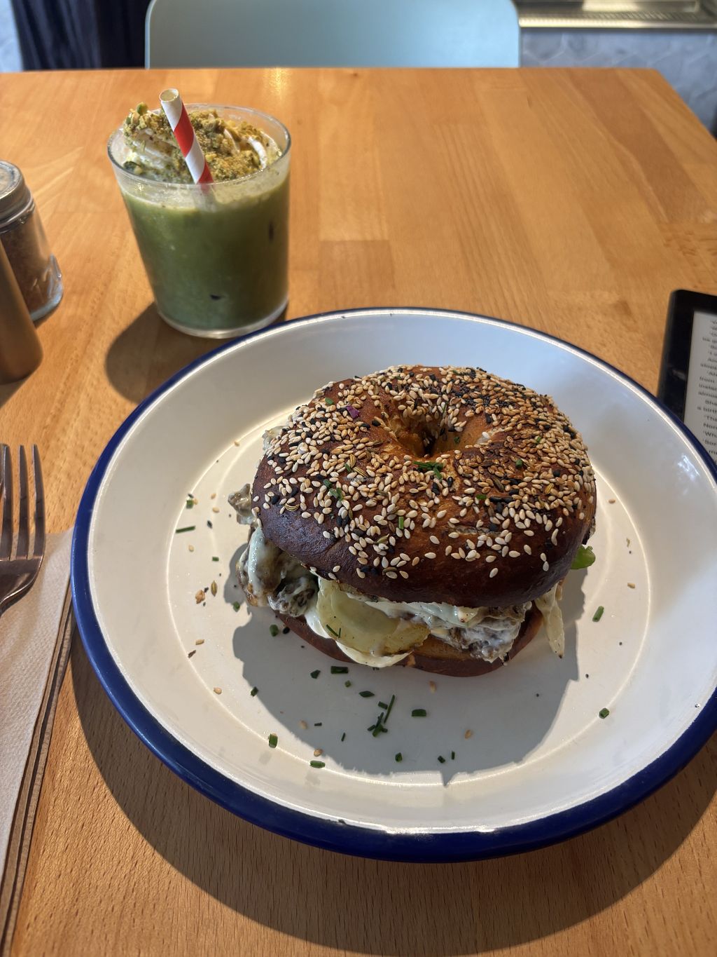 Came here for an early lunch. They’d released a new menu a couple of days ago. I had studied it before arriving and opted for the iced tiramisu latte and a chefs special bagel (pineapple, “pulled pork” made with mushrooms, rocket and mayo. The iced tiramisu was the perfect balance of coffee with the tiramisu on top. Very refreshing. The bagel was delicious. I liked that it was a seeded bagel. The mushrooms were very well prepared and I liked the pineapple with it too.