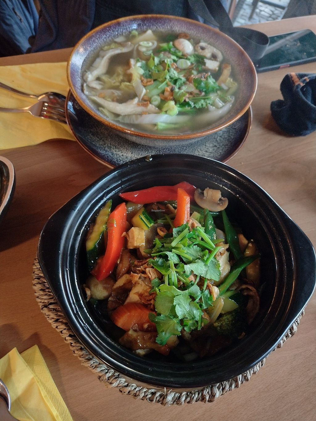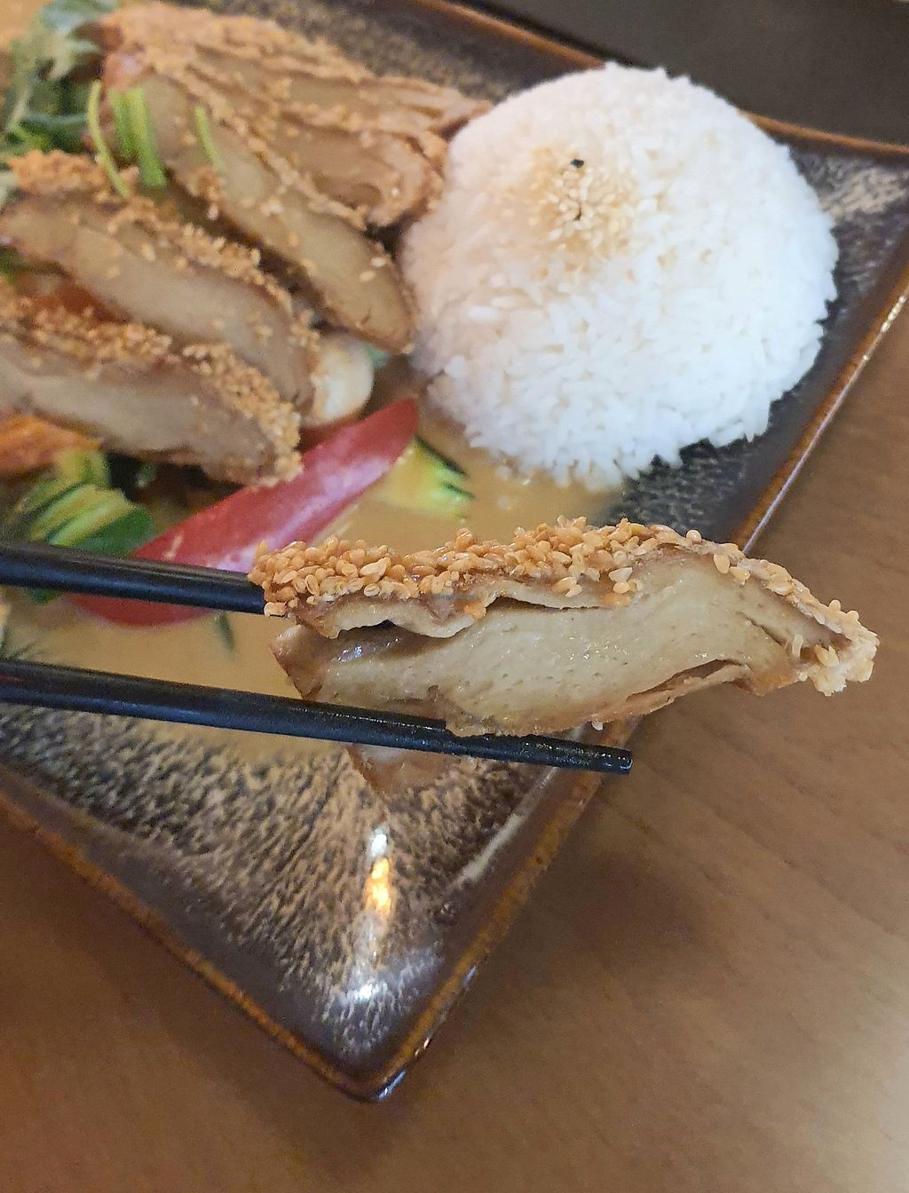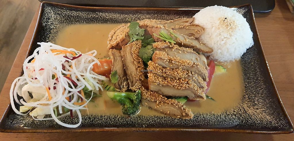 Com Sot Lac (peanut sauce in coconut milk) with vegan duck