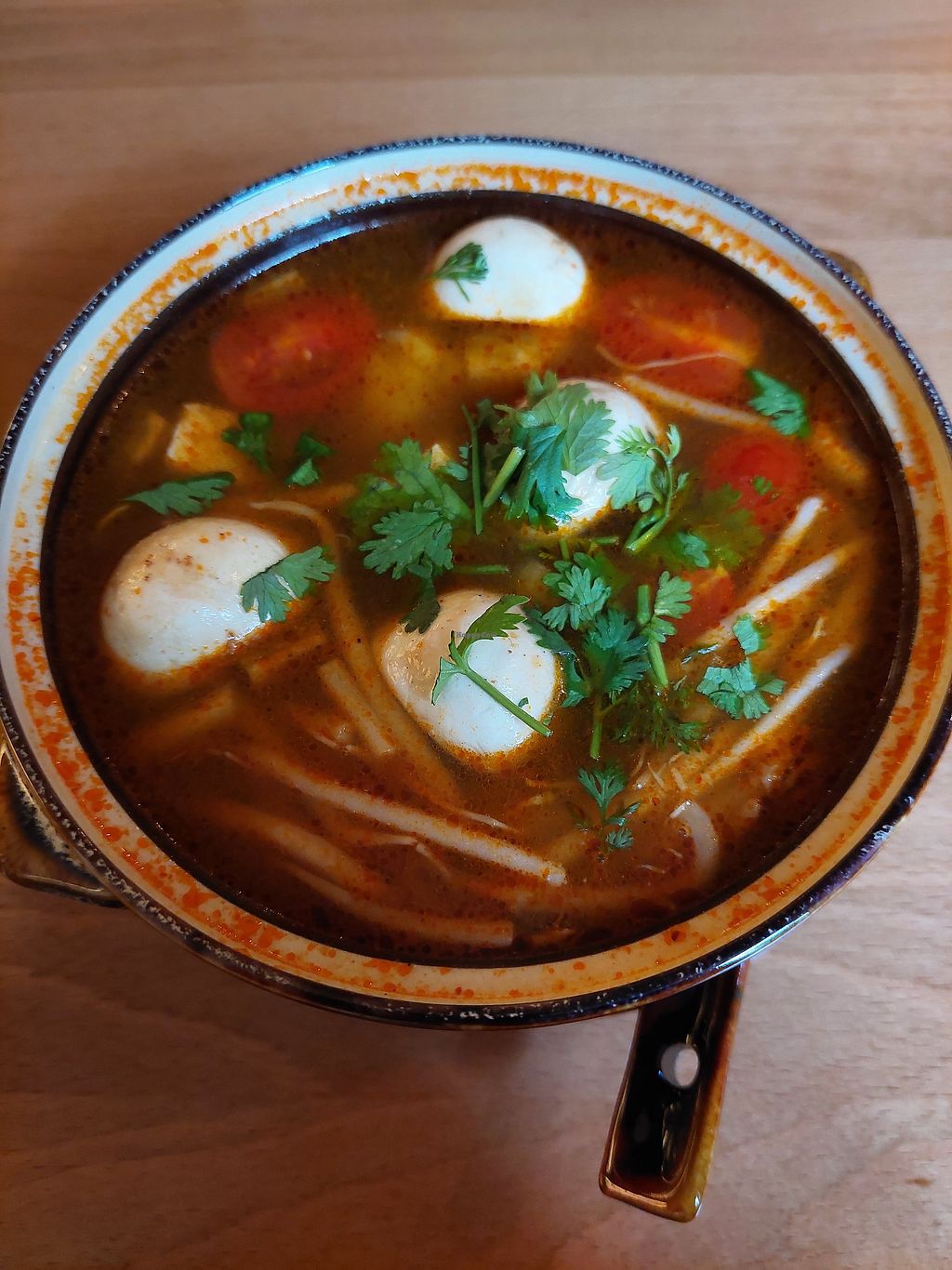 Sup Chua Cay (no. 1) sour-spicey with tofu, veggies, herbs (5.9€)