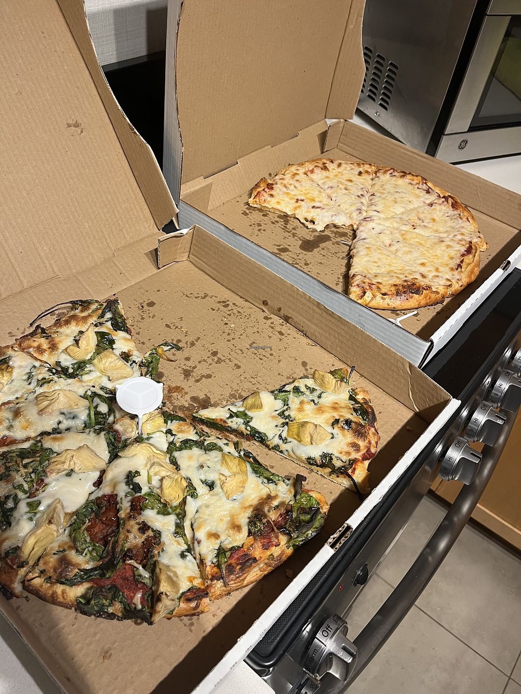 We ordered two pizzas - a vegan cheese and a vegan spinach, artichoke and sun-dried tomato. It was quick - just 25mins for pickup. It was $70 for 2 pizzas, but we figured for the price will be tasty and we were hungry!