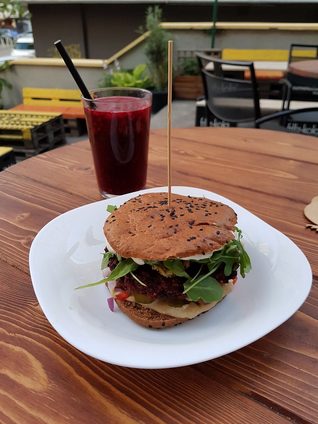 Beetroot burger (small!?) and hibiscus iced tea.