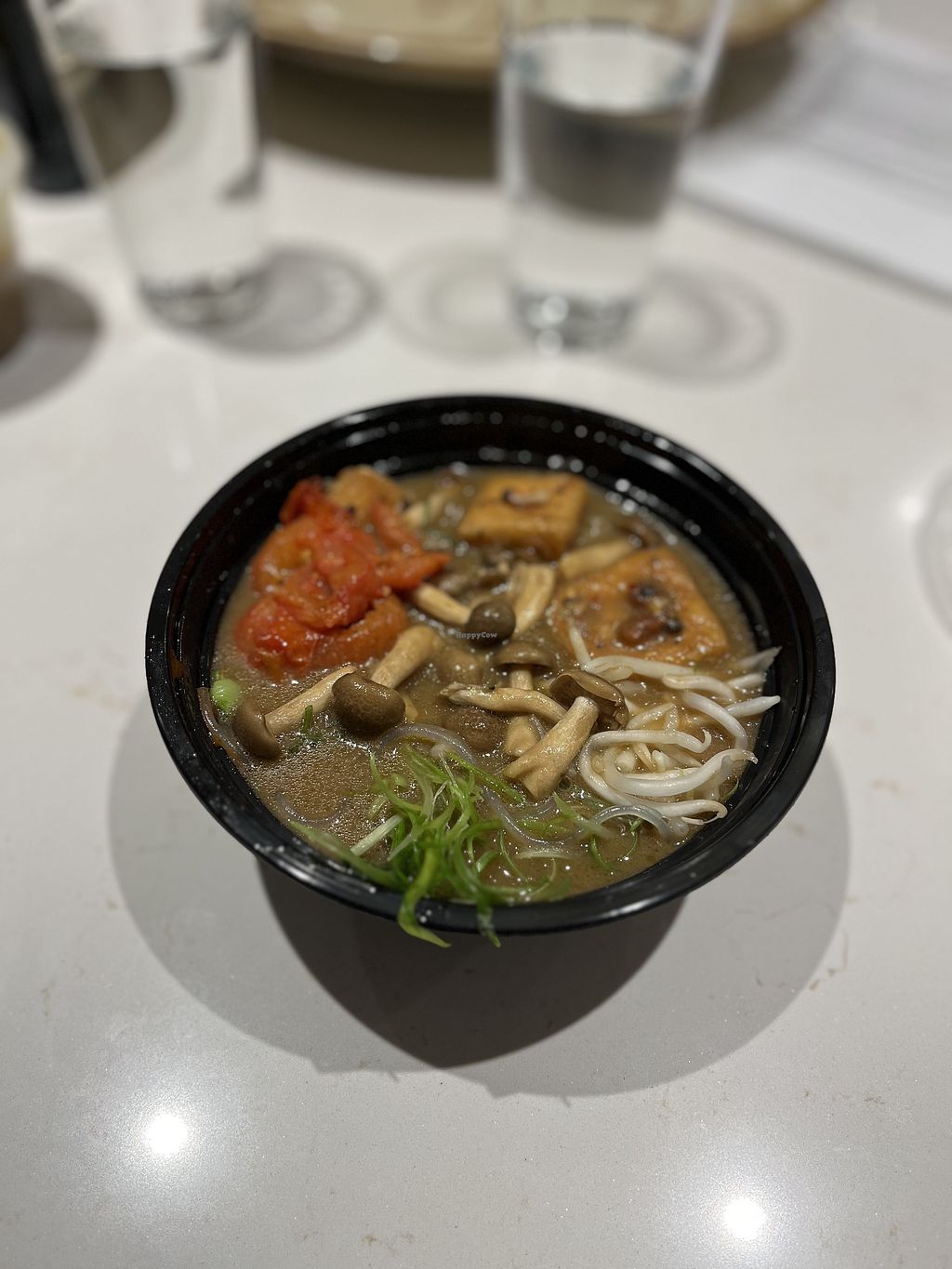 Delicious, creamy (cashew), and mushroomy ramen broth with excellent noodles and veggies, but be sure to ask for the tofu to NOT be fried because it's made on shared equipment with meat; you can ask for raw tofu instead, if you're into that :)