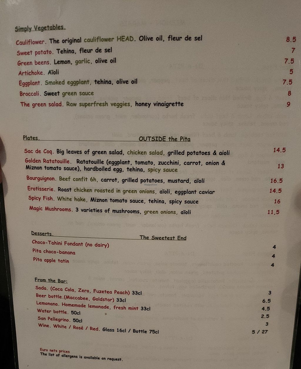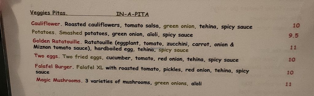 I’ve been told by one of the staff member the other day that the pita is bought externally and contains eggs. She was very sorry. The other members of the staff (even from the other restaurants) are not well informed of that and she said she’ll pass the message. I’ve been eating there multiple times and no one ever mentioned anything. I tried to reach out to the restaurant about this information but didn’t get answer.