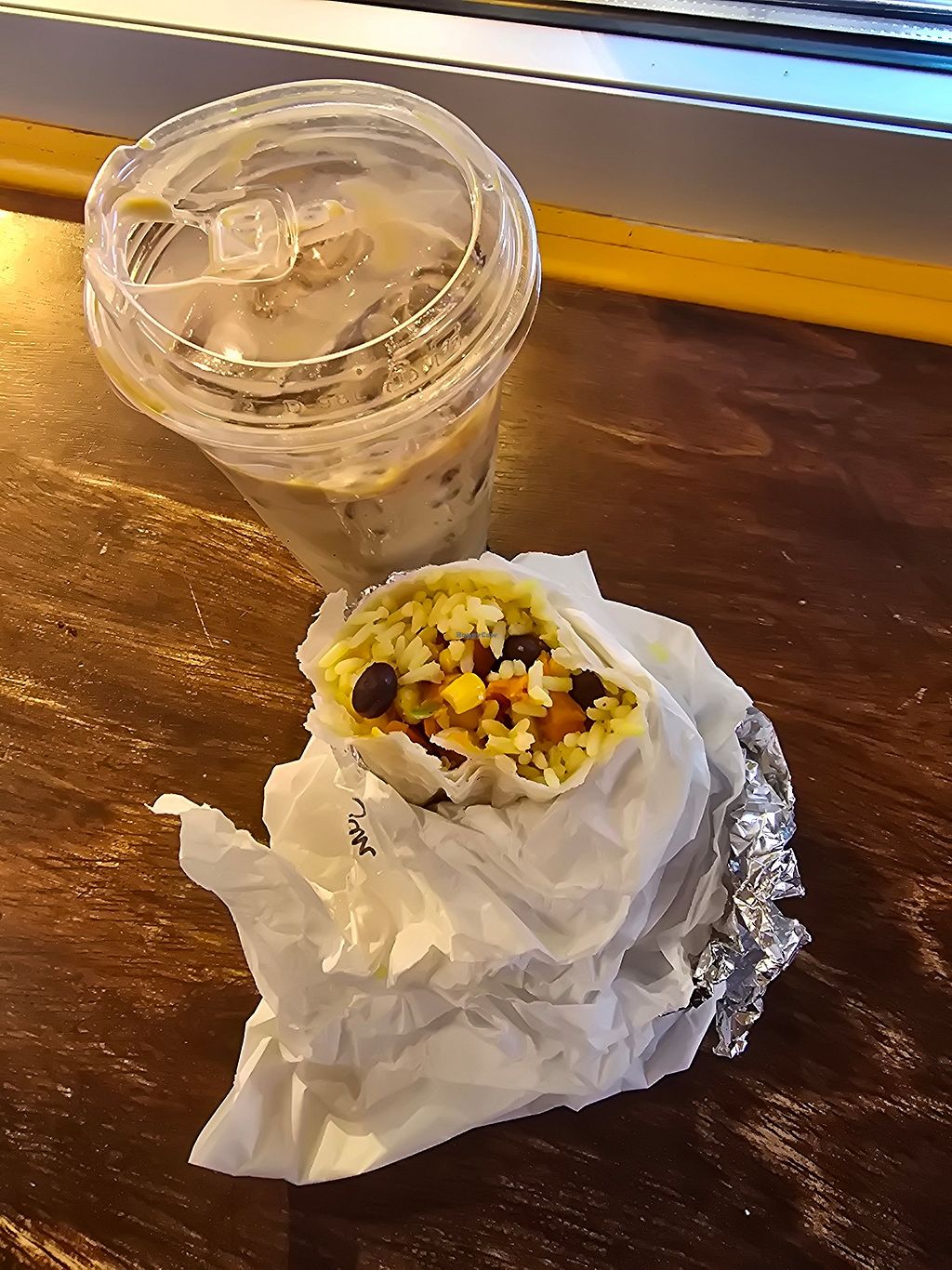 Vanilla vegan donut and quad iced latte with oat