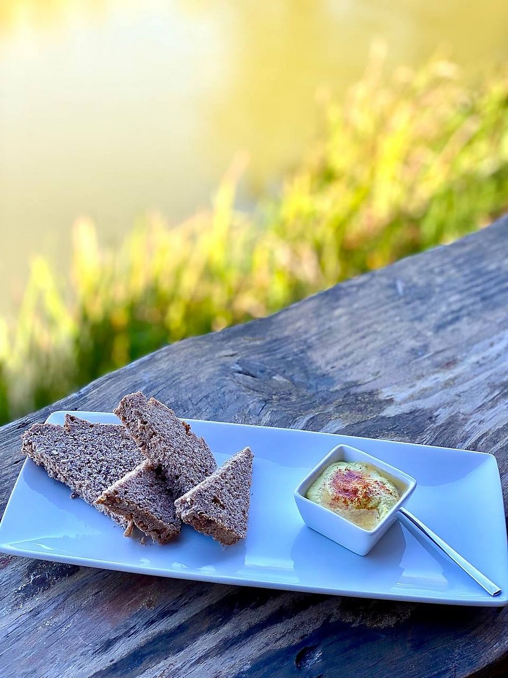 Torrada com queijo vegano (também disponível com pesto ou hummus) / To…