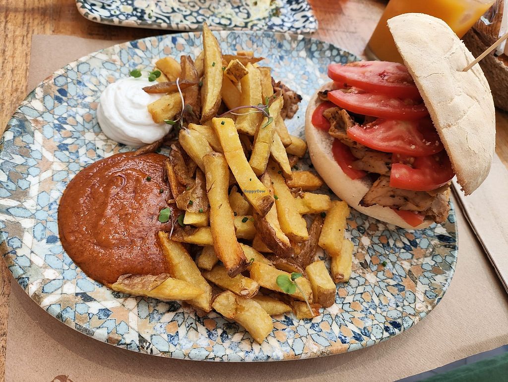 Serves meat, vegan options available. Gluten-free restaurant offering vegan breakfast, lunch and dinner. Dishes include vegan "chicken" curry, tacos, tapas and more. Open Mon-Fri 08:00-17:00, Fri 20:30-00:00, Sat 13:00-00:00, Sun 13:00-17:00.