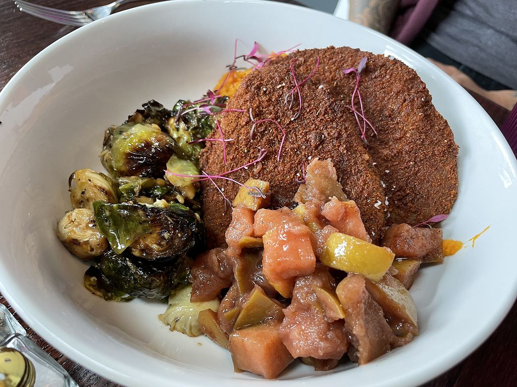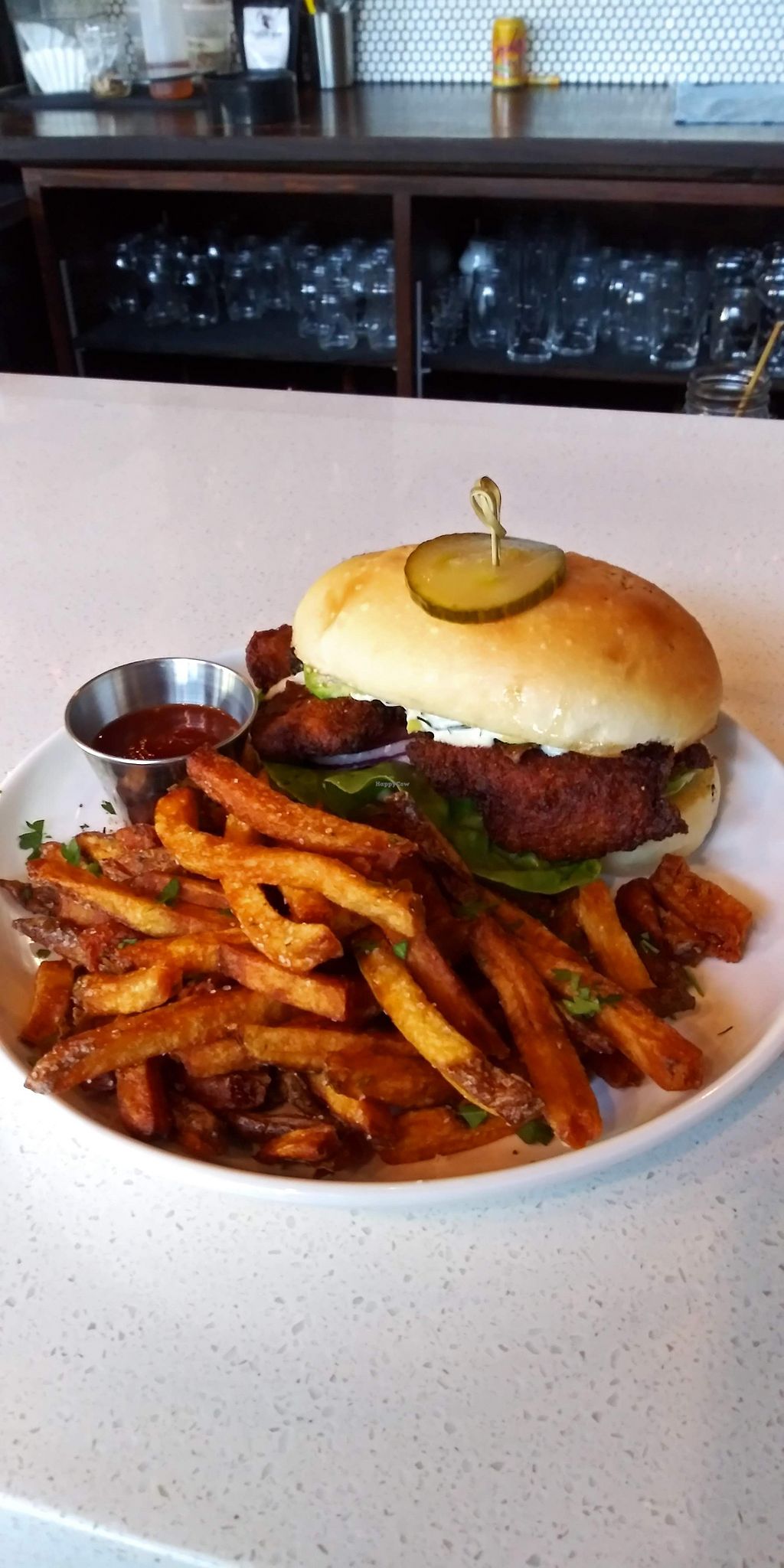 Chickpea cutlets with mushroom bacon on a bun | fries | house made ket…
