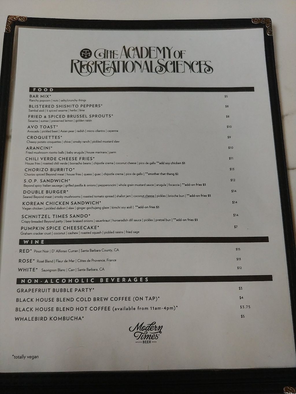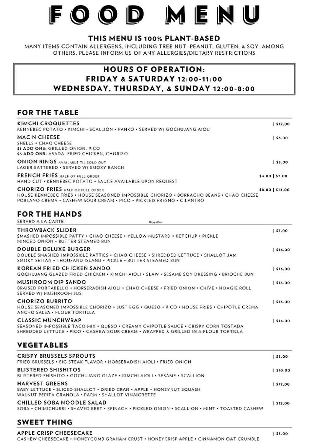 An all vegan menu with creative, rich, and tasty offerings, as well as alcoholic and non-alcoholic beverages.