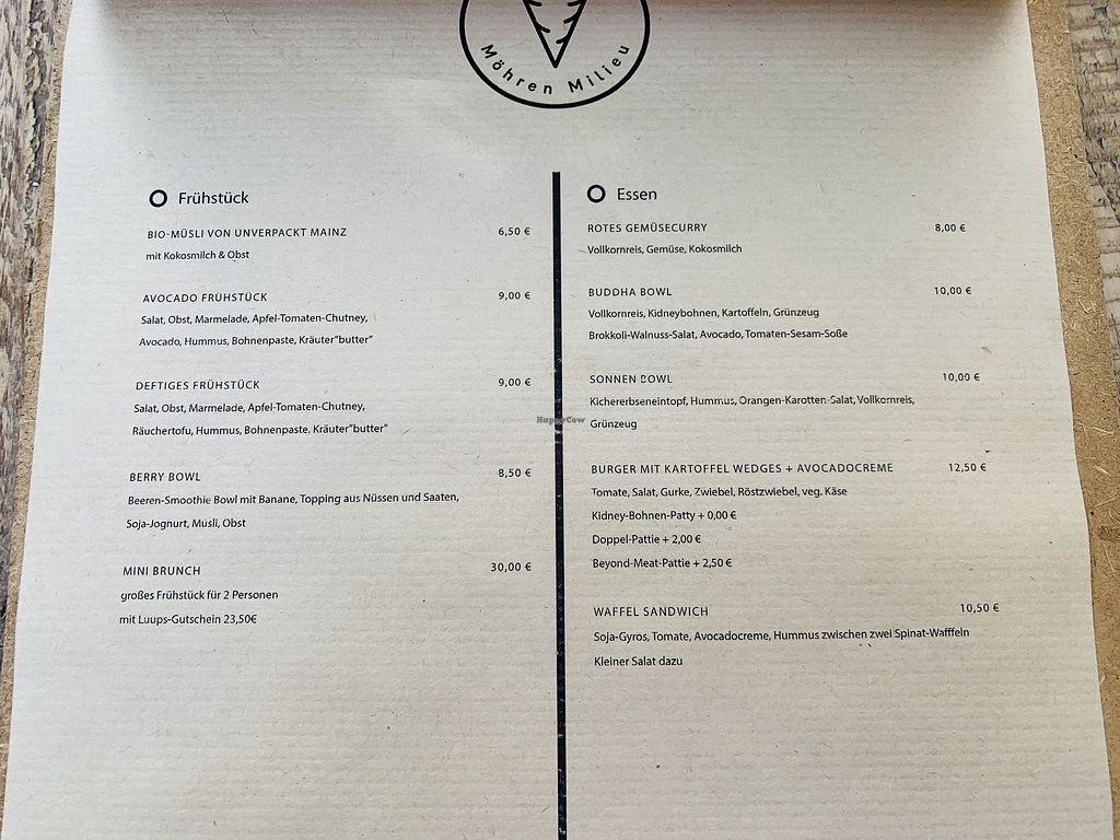 The first vegan restaurant in Mainz, located on a quiet street in walking distance to the train station. Offers snack foods like burgers and sandwiches, small pizza, cakes. A small corner inside sells vegan products. The owners also run a Moehren Mobil food truck which operates at local markets and events. Reported closed May 2023.
