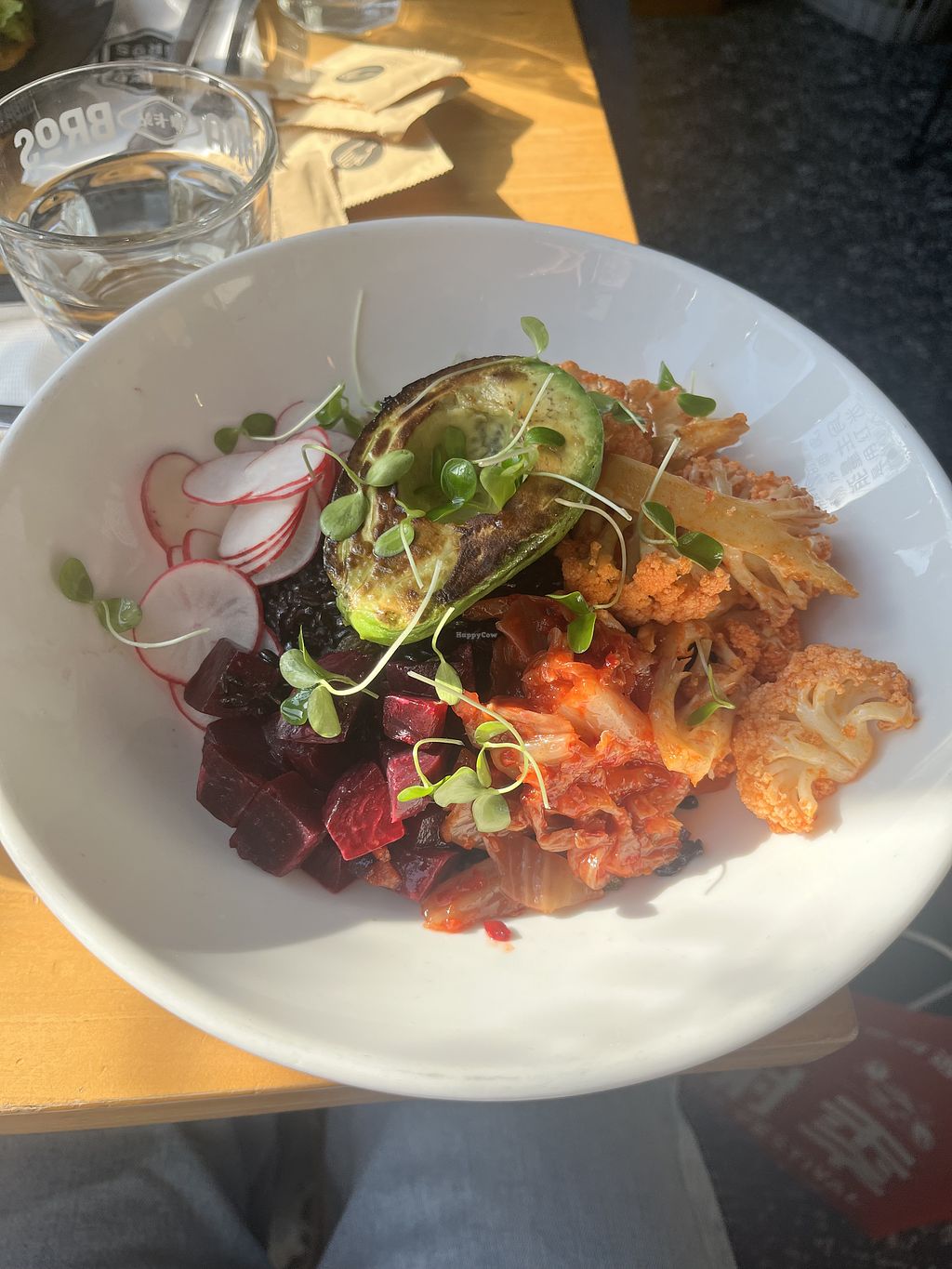 Serves meat, vegan options available. Fast-casual dining offering breakfast, salads, bowls, sandwiches, smoothies and a variety of beverages. Soy milk is available. Vegetarian and vegan items are marked on the menu. Can substitute tofu for another protein. Open Mon-Sun 8:00am-10:00pm.