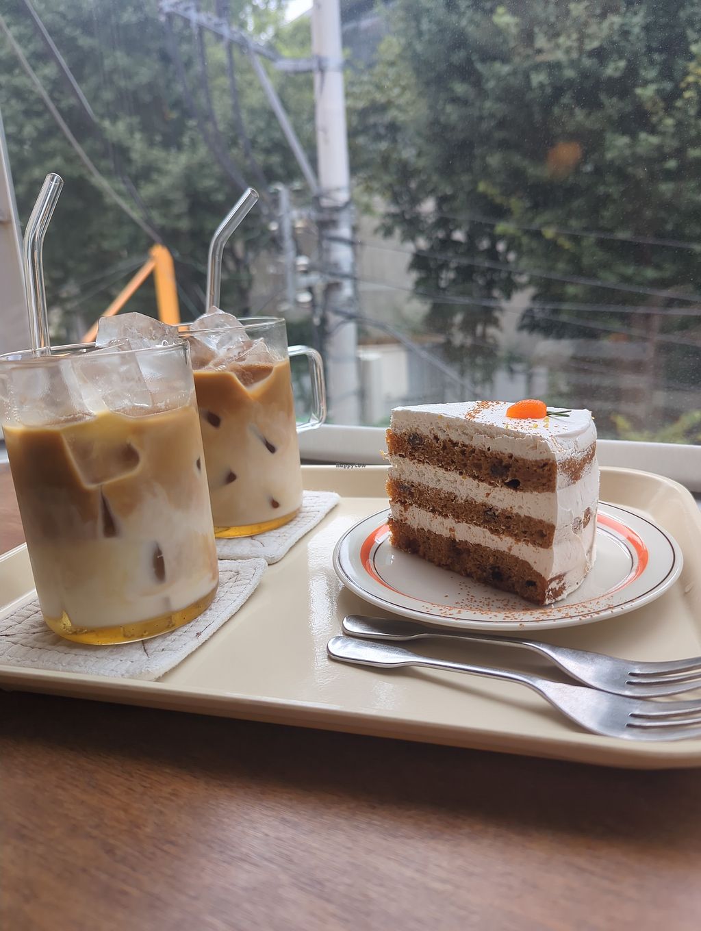 Carrot cake and tea latte with soy milk