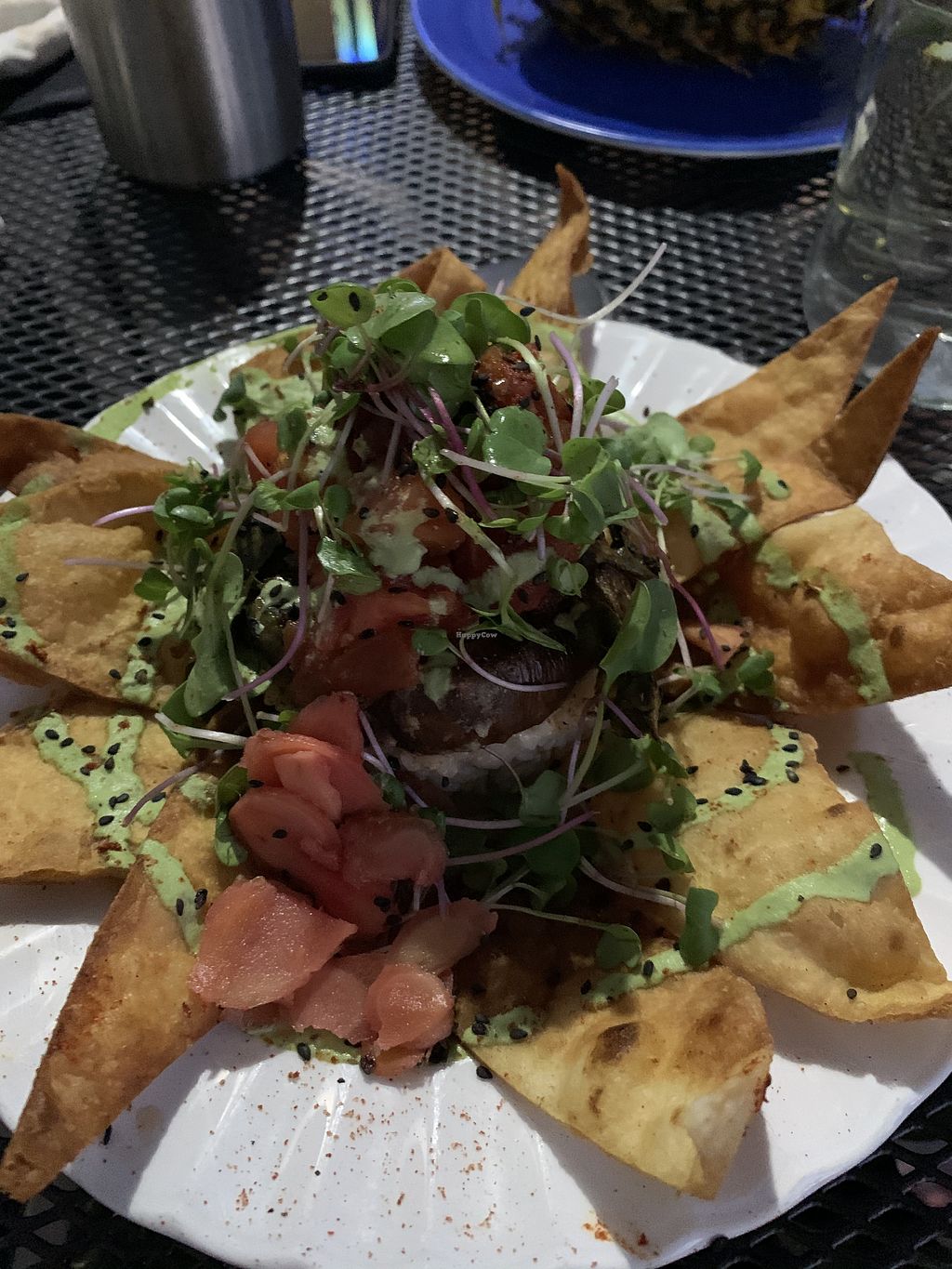 Loco Moku served in a pineapple. Raw pad Thai in back
