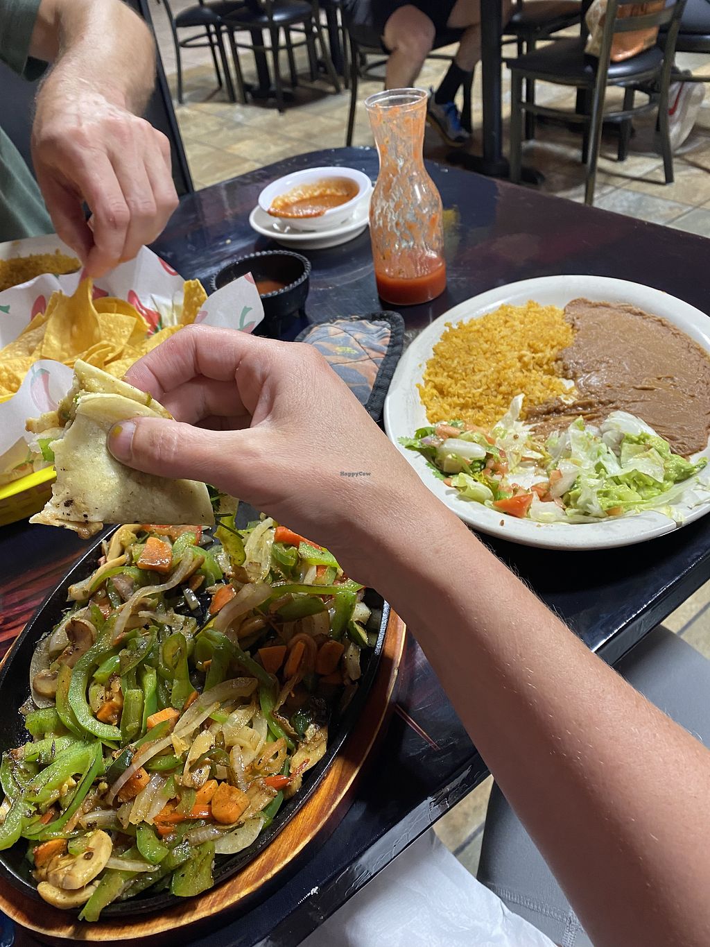 Serves meat, vegan options available. Mexican restaurant with vegetarian dishes that can easily be made vegan upon request. Example offerings include vegetable fajitas, chimichanga, mixed vegetable burrito and more. Specify no dairy when ordering. Open Mon-Sun 11:00am-9:00pm.