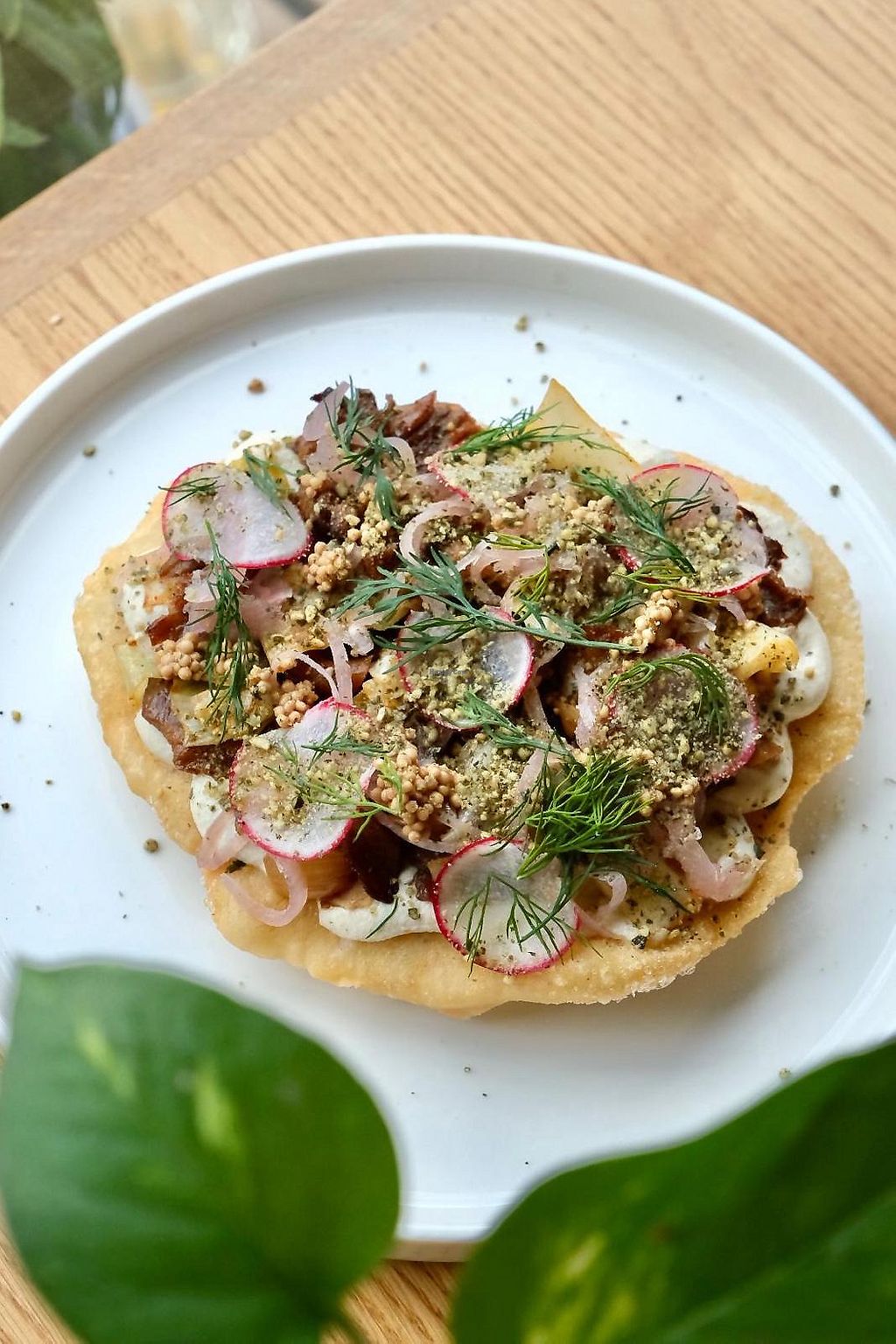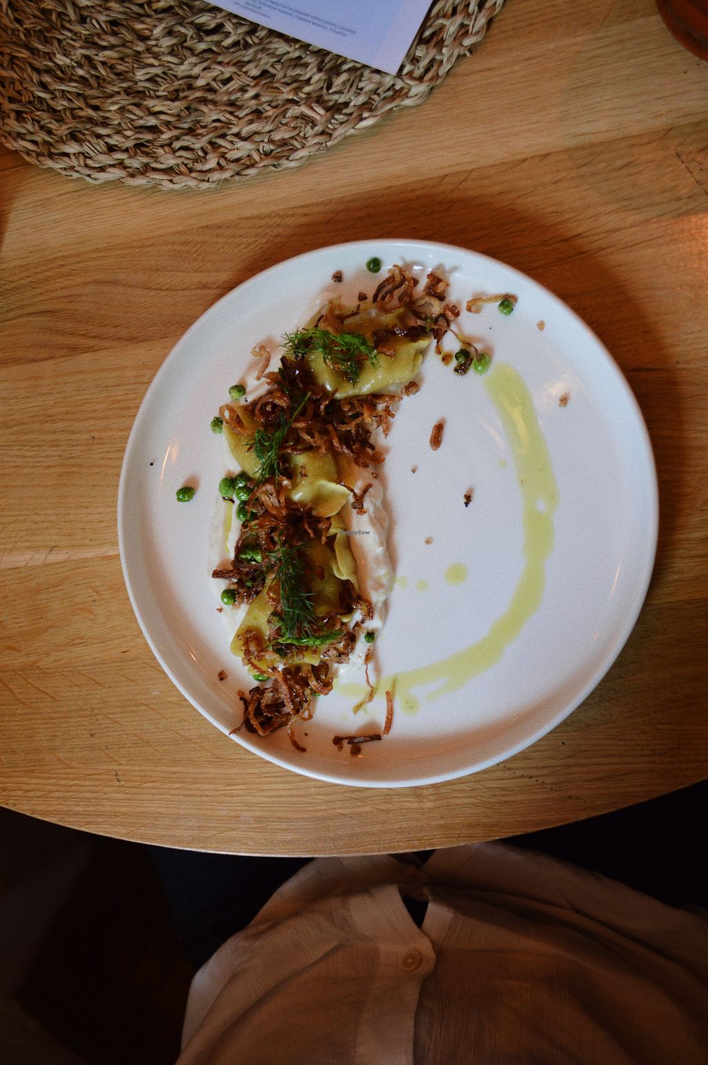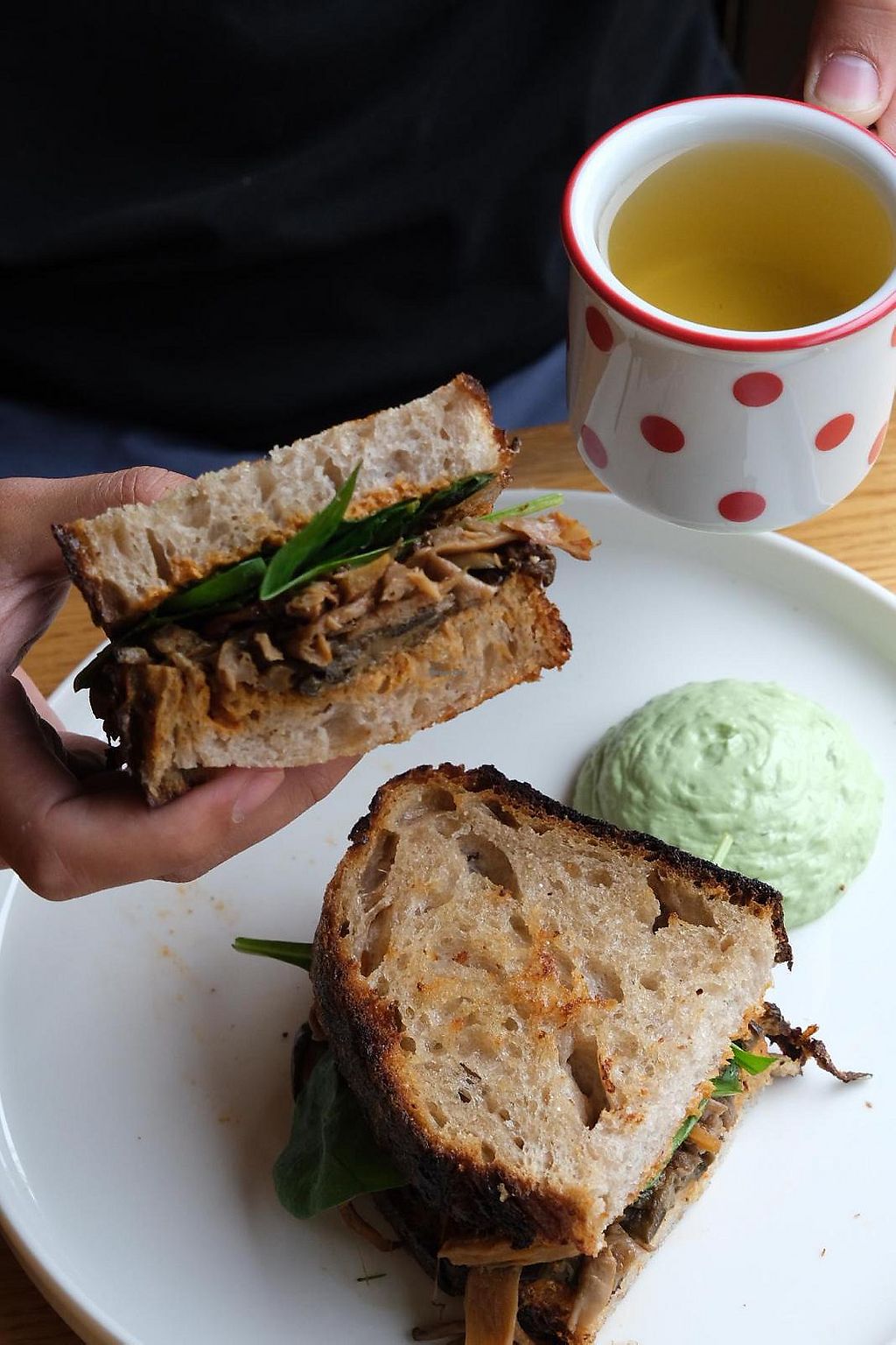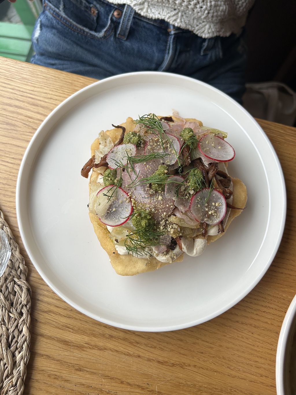 lopas with pesto and dill sauce. smoked mushrooms on top