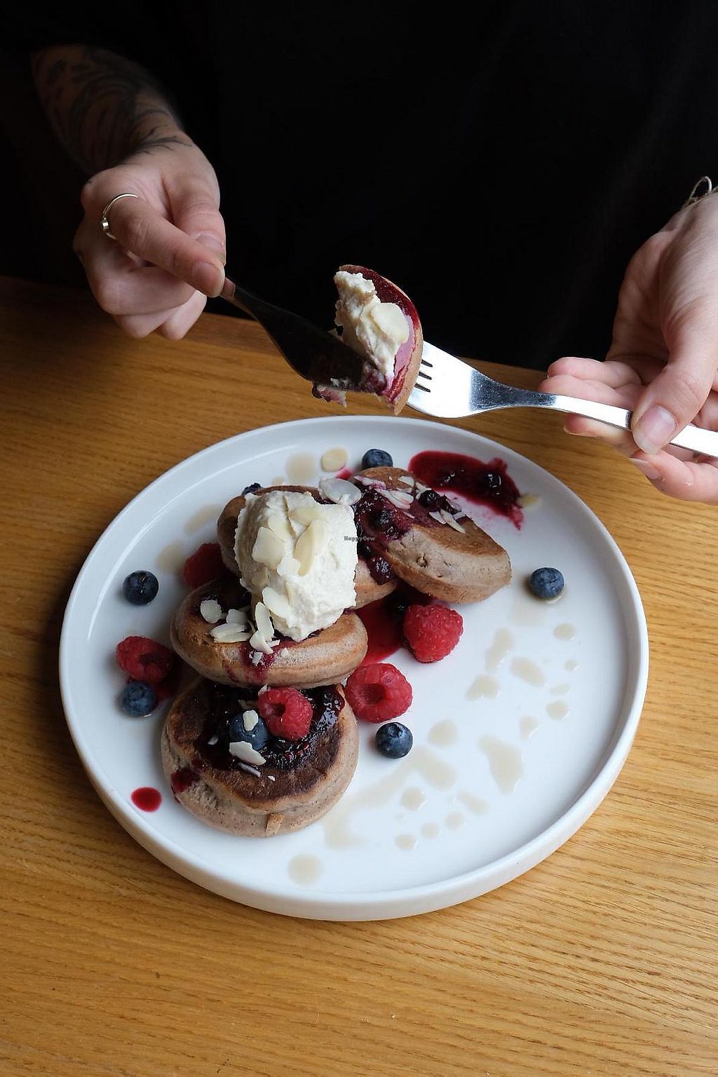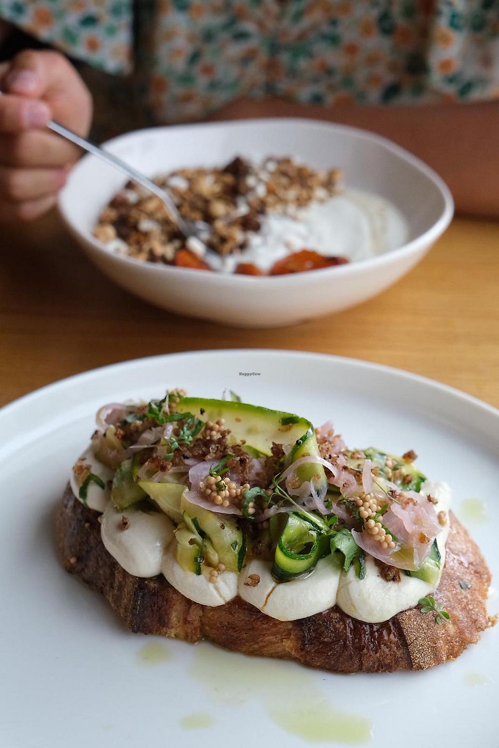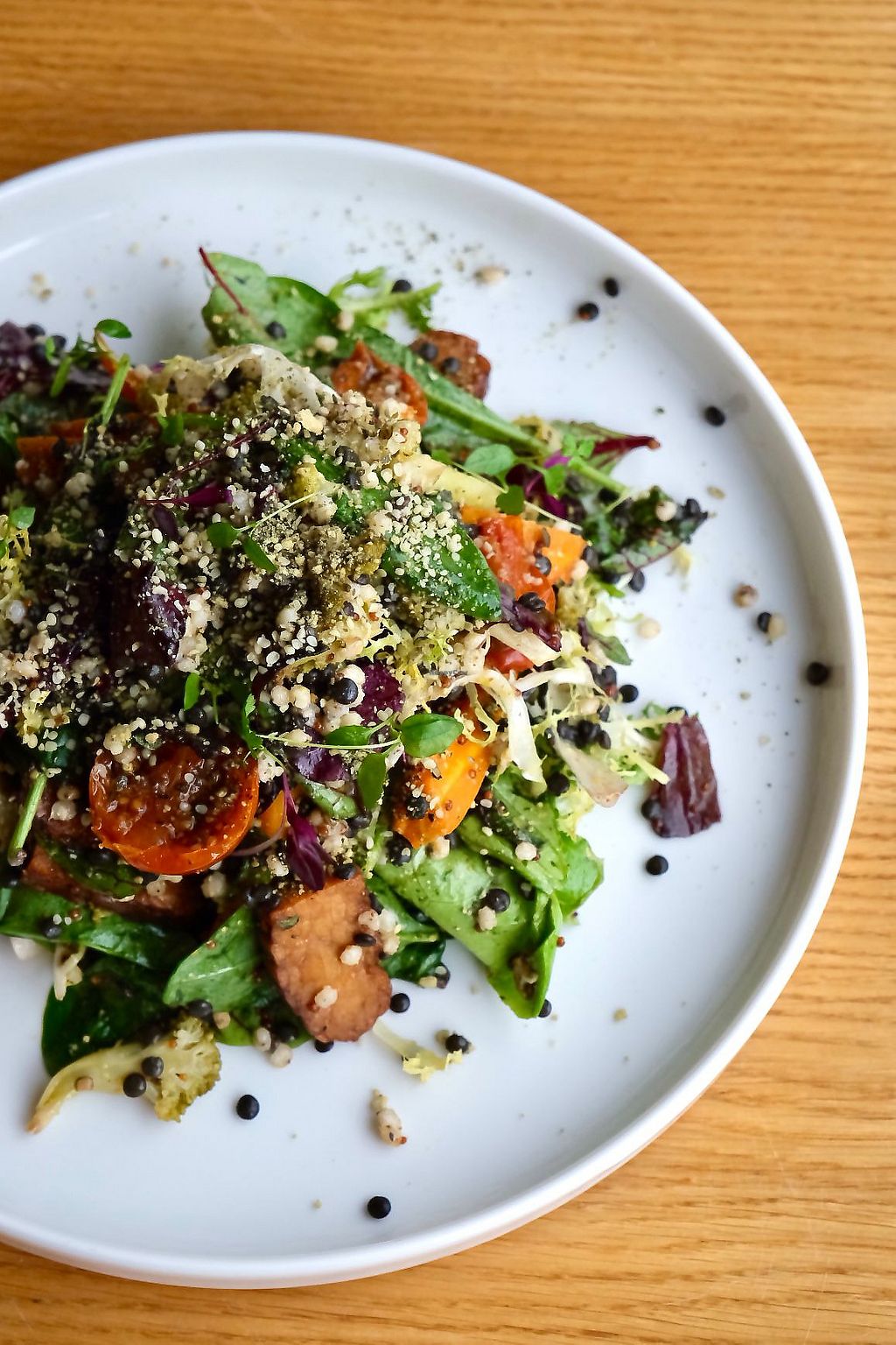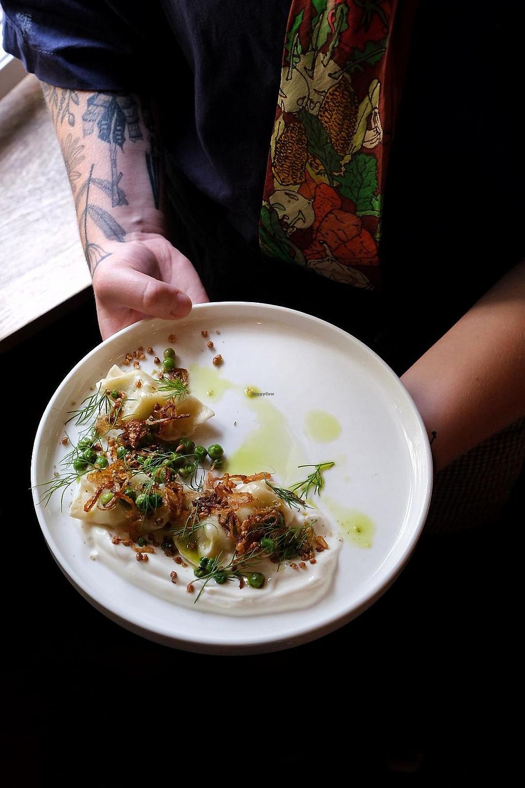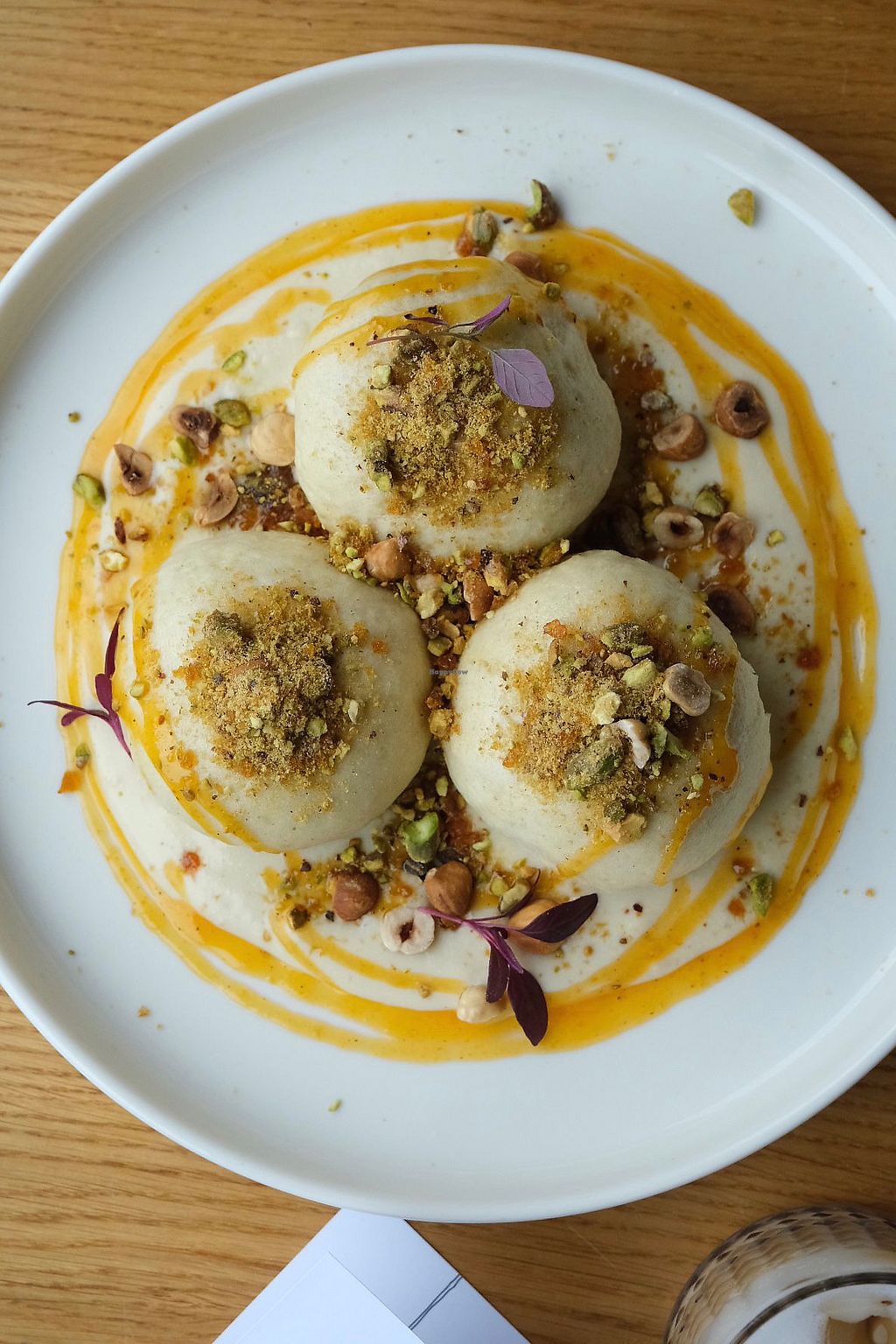 lopas with pesto and dill sauce. smoked mushrooms on top