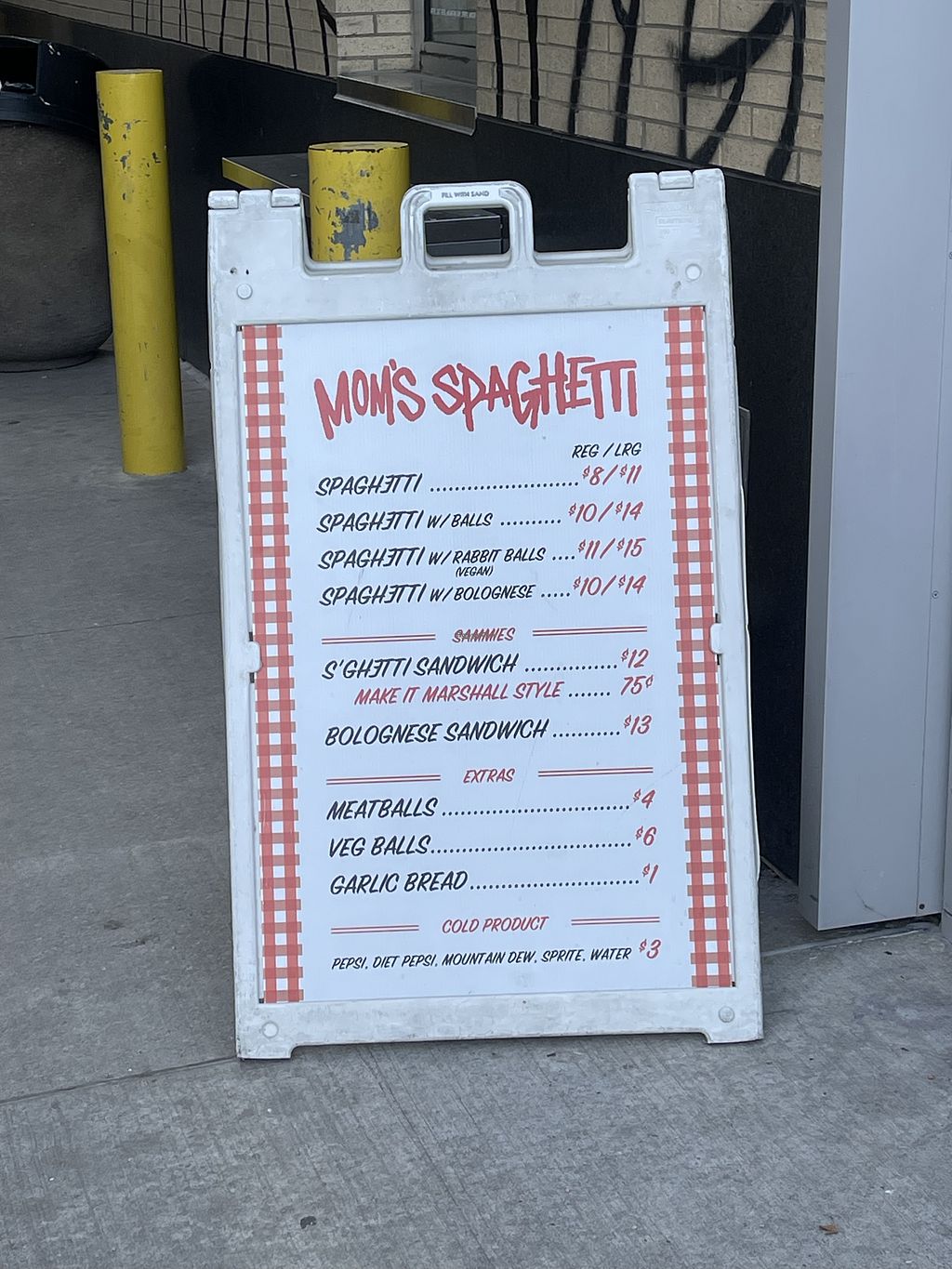 Nice this is open late until midnight! Even on Monday when pretty much nowhere else is open. So on a cold night when you need a quick bite this will hit the spot! Warm and comforting just like mom intended! Now one thing is I brought my own follow your heart Parmesan cheese which I purchased at the nearby Whole Foods because they do not offer a vegan cheese here so byoc!!