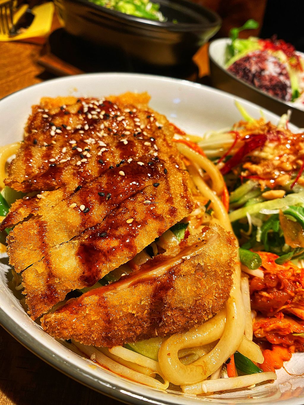 Everything came with great kimchi, super-fresh greens, and purple rice. Proteins were crisp, which is nice too.