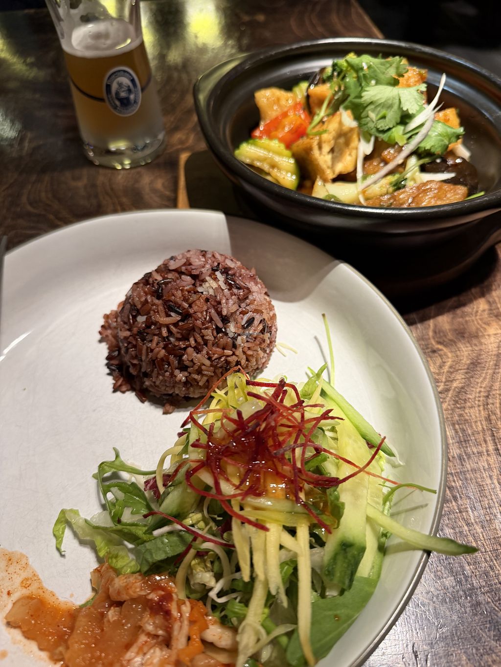 Kho To oyster mushrooms, tofu, tempeh and vegetable bowl in a dark sau…