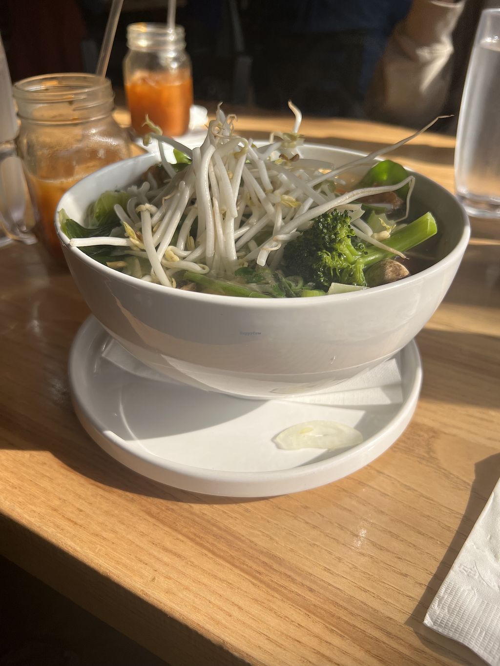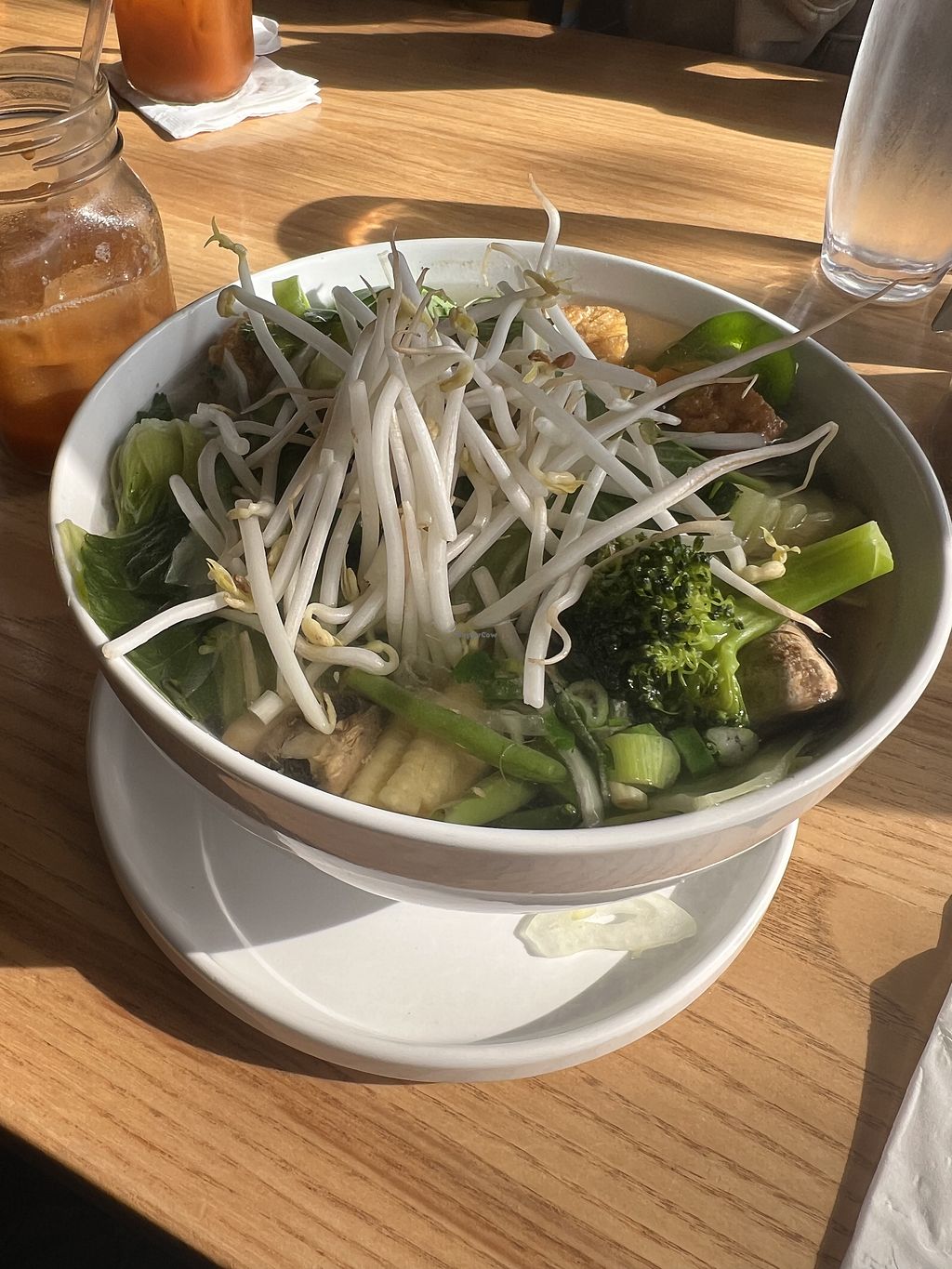 The vegan options were mostly appetizers - the entrees may be able to veganize. The one clearly labeled vegan entree was veggie pho. It was decent, standard pho. The Thai ice tea was yummy, I was able to choose almond and oat milk. Smaller space in a cool area.