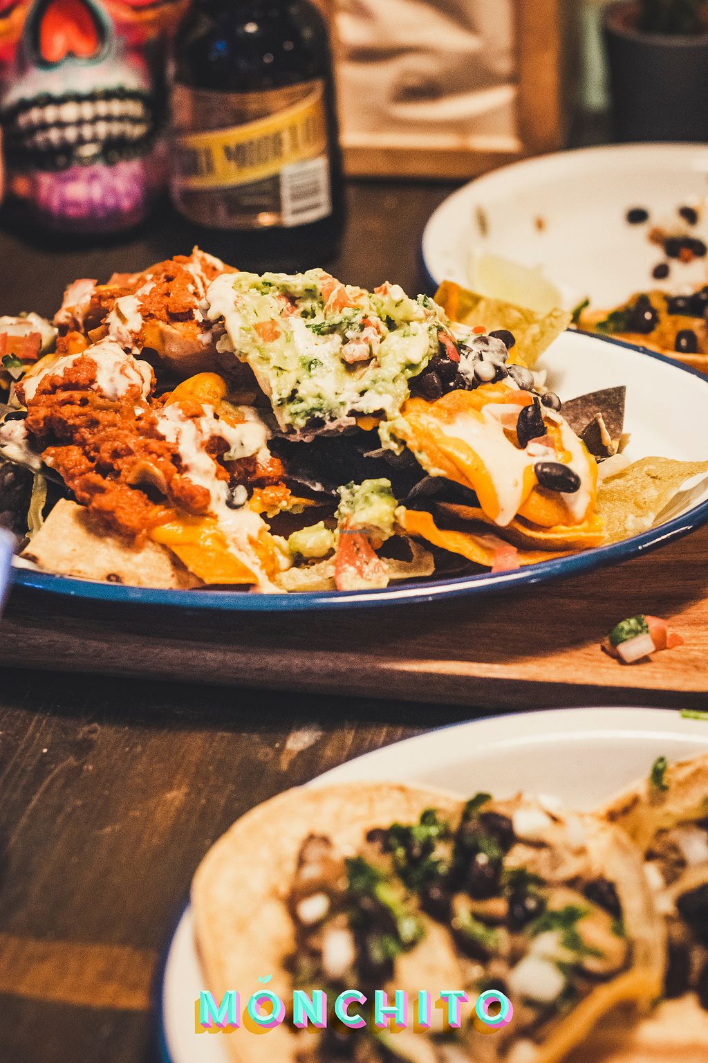 Nachos with guacamol, vegan cheddar and vegan bolognese