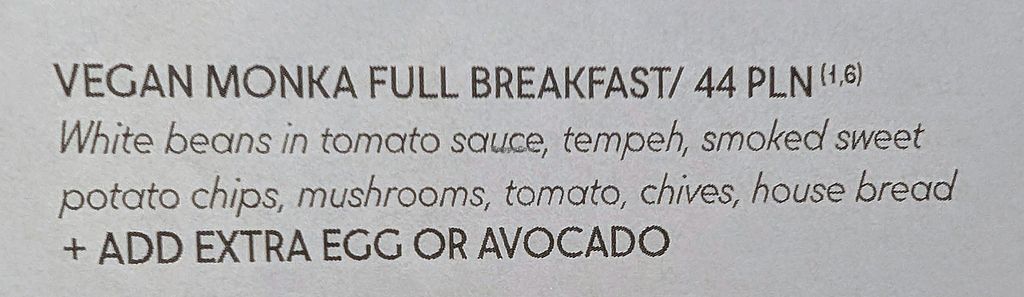 Very good V plate in breakfast/brunch meniu - Vegan Monka full breakfast (white beans in tomato sauce, tempeh, smoked sweet potato chips, mushrooms, tomato, chives, house bread) 44 PLN, extra avocado (half) can be added 12PLN, plant based milk