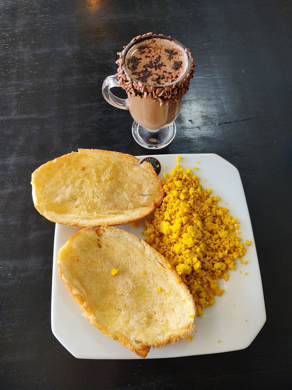Capuccino com brigadeiro, pão na chapa e tofu mexido.