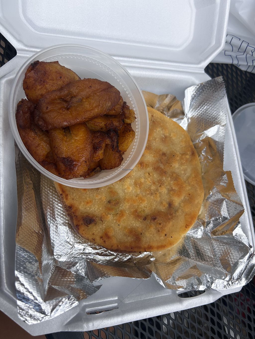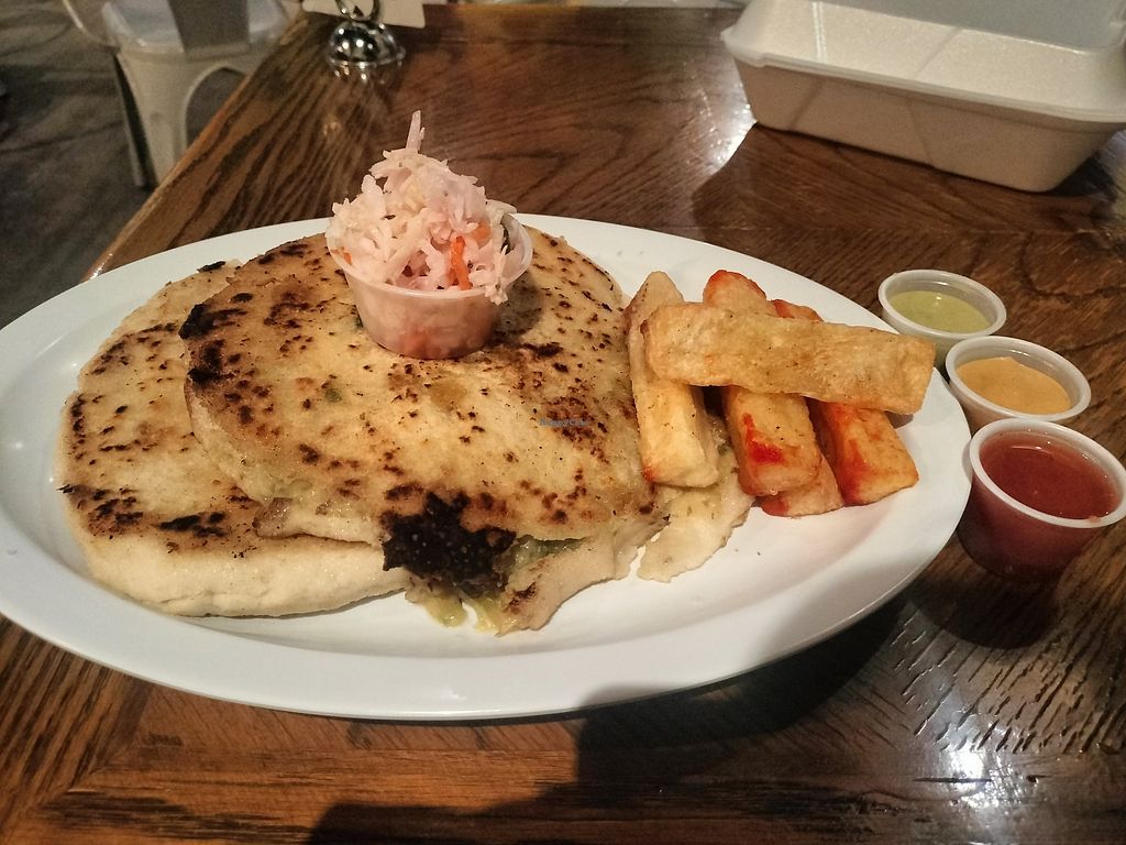 Yucca fries and 2 pupusas (vegan carnitas and vegan soyrizo). Went bac…