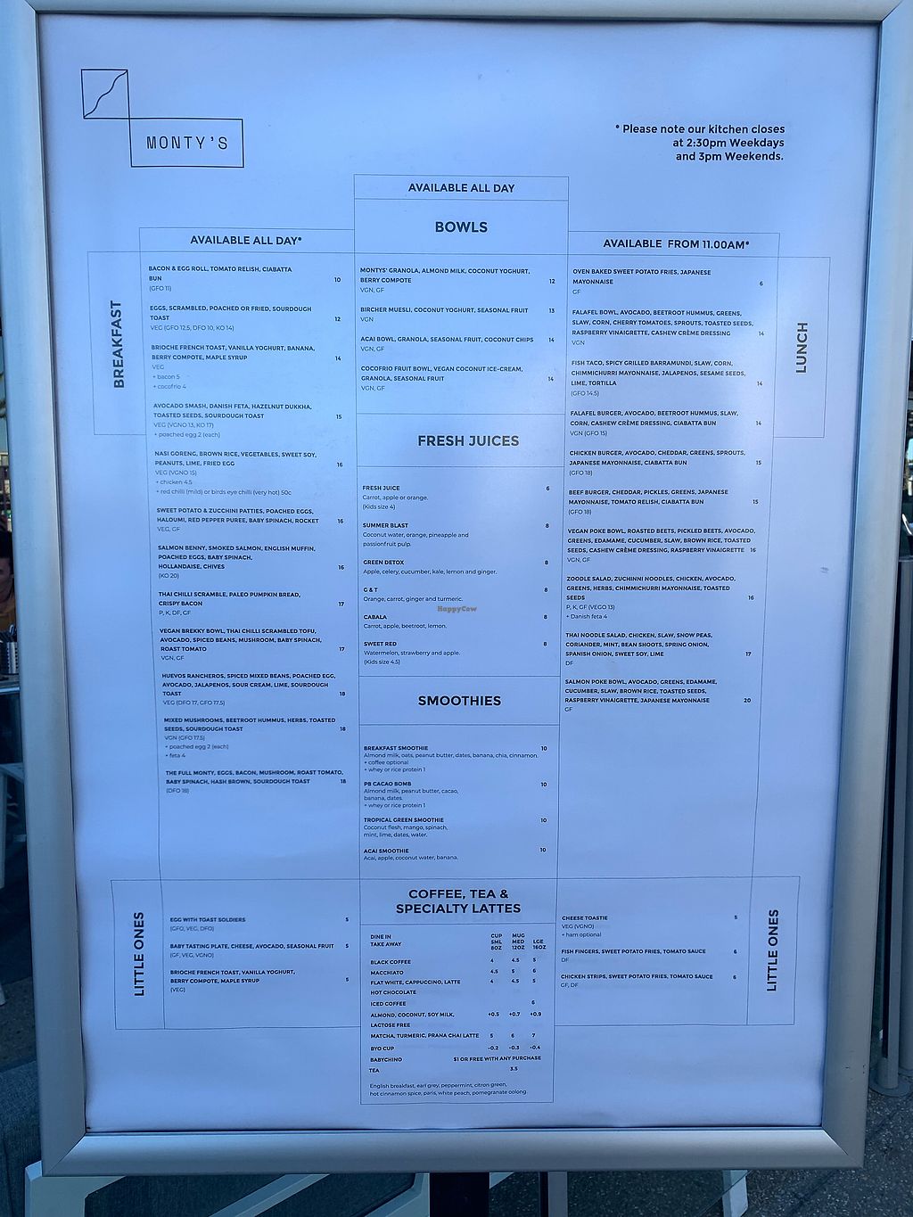 Serves meat, vegan options available. Offers juice and smoothies, acai, muesli, Cocowhip, and other vegan dishes like smashed avocado on sour dough with hazelnut dukkha, brekky bowl, zucchini noodles with basil pesto, falafel burger, vegetable lentil curry. Reported closed April 2024.