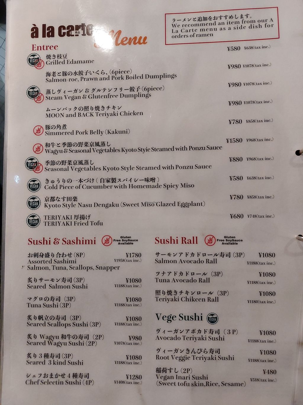 Their à la cart menu also has several vegan options and they had limited time vegan gyozas.