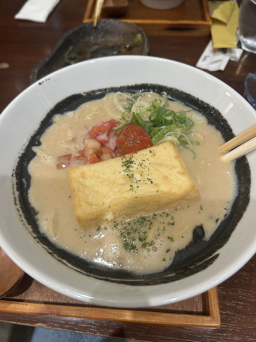 Perfect thick creamy spicy broth for a cold rainy day! I don’t eat spring onions and they were very accommodating in not adding it. Oh and adding the half boil egg and fried tofu is so good!