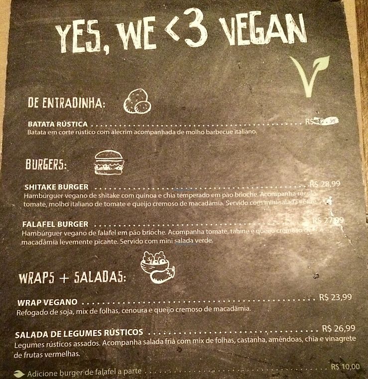 - Falafel Burger : Vegan falafel burger in a brioche bun. Tomatoes, tahini and lighlty spiced creamy macadamia cheese. Served with a small green salad. R$ 27,99