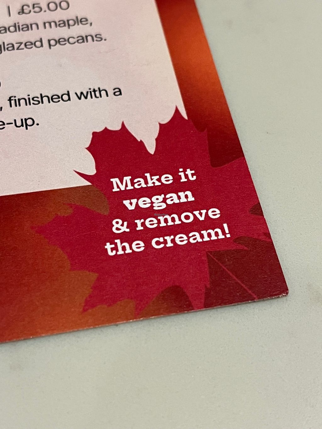 Pros: Vegan options, Vegan labelling, Helpful staff as to vegan options