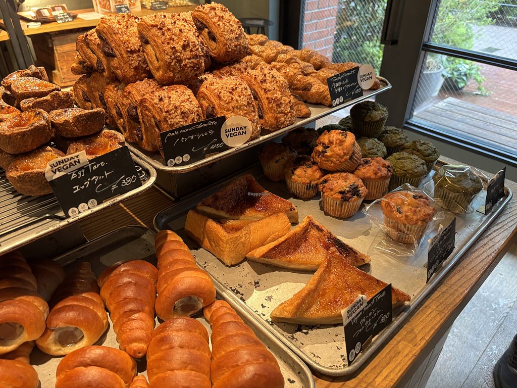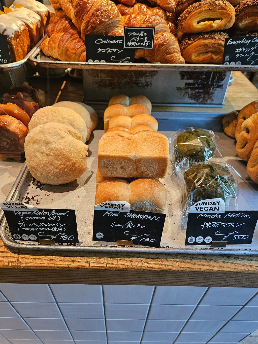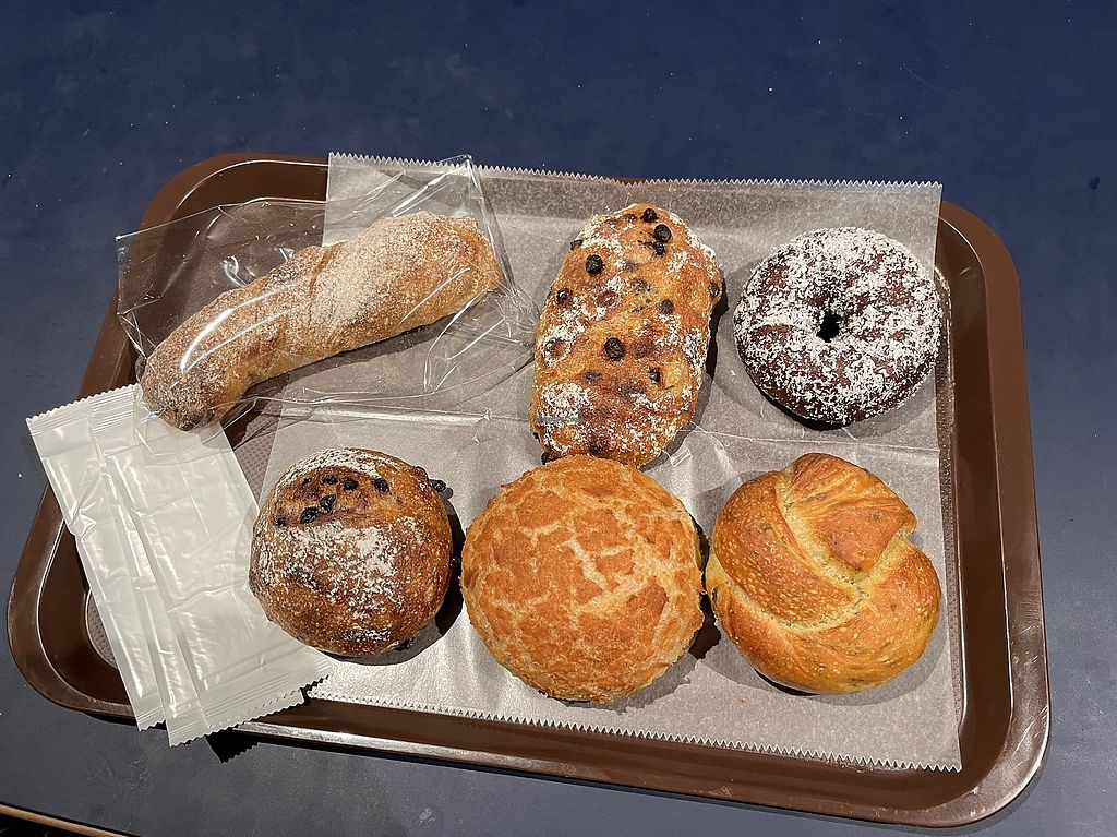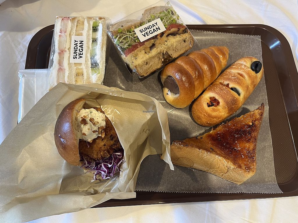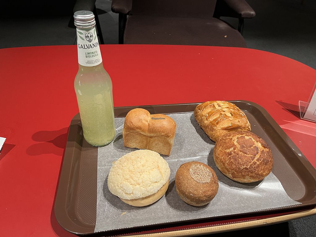 left 3 vegan: melonpan, bean paste bun and milk bread, right side is v…