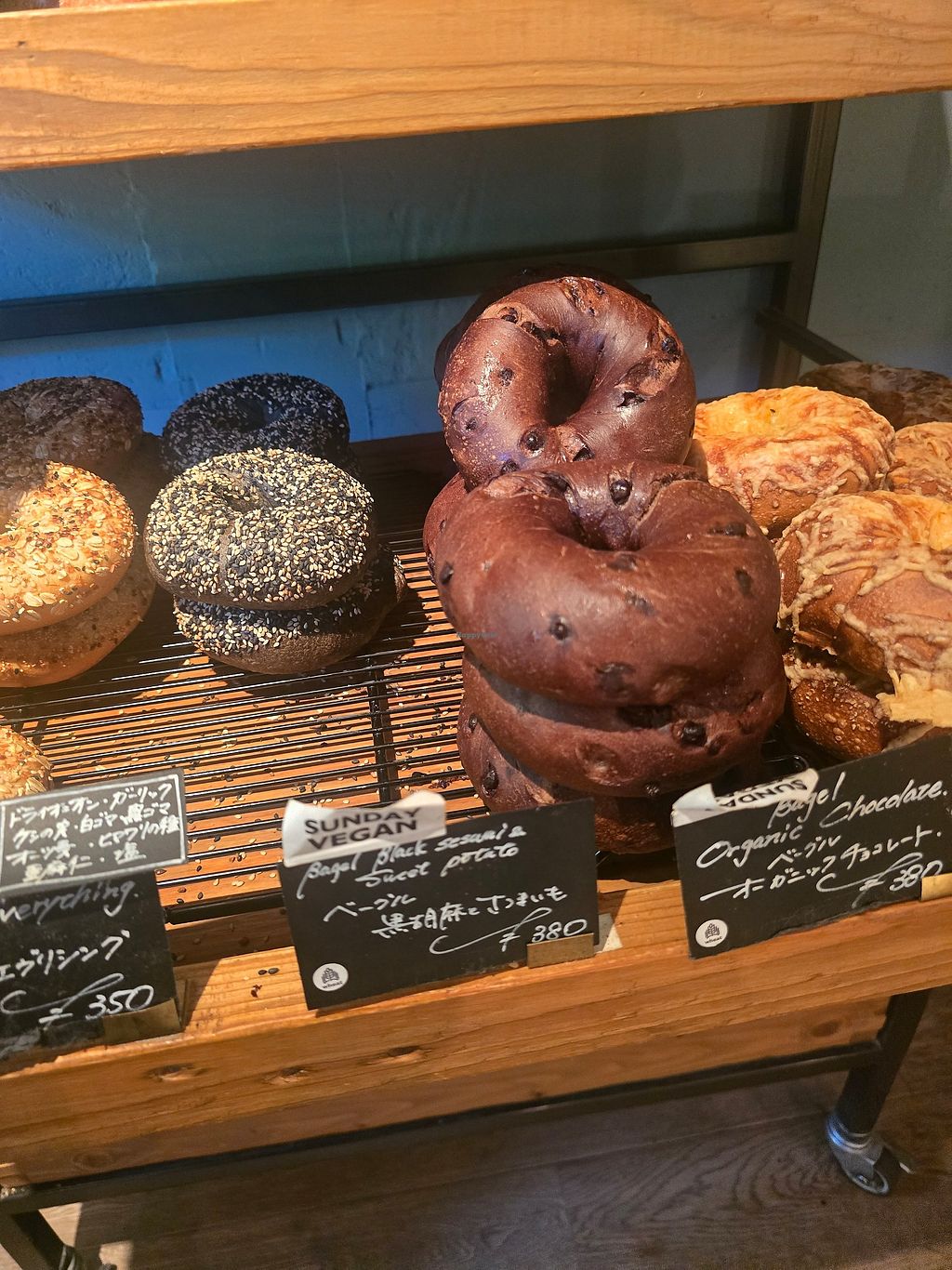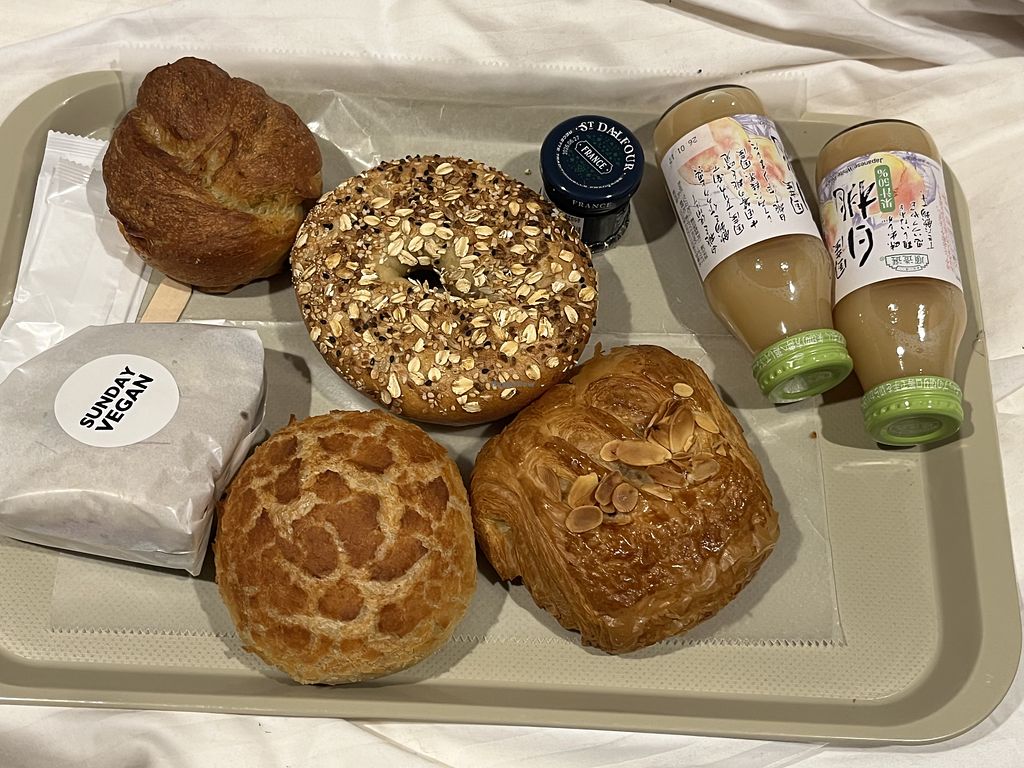 left side and top half vegan: seaweed focaccia, bagel with blueberry j…