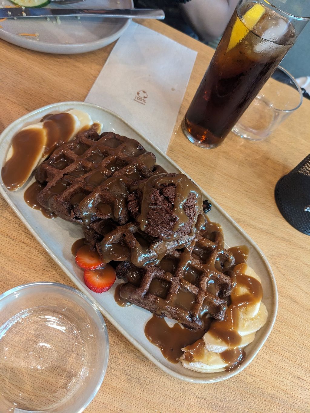 One of the best tofu scrambled ever, everything super fresh and tasty, waffles blew my mind, combination of chocolate and caramel goes hard, melted my stomach brain and exploded my taste synapses.